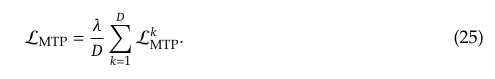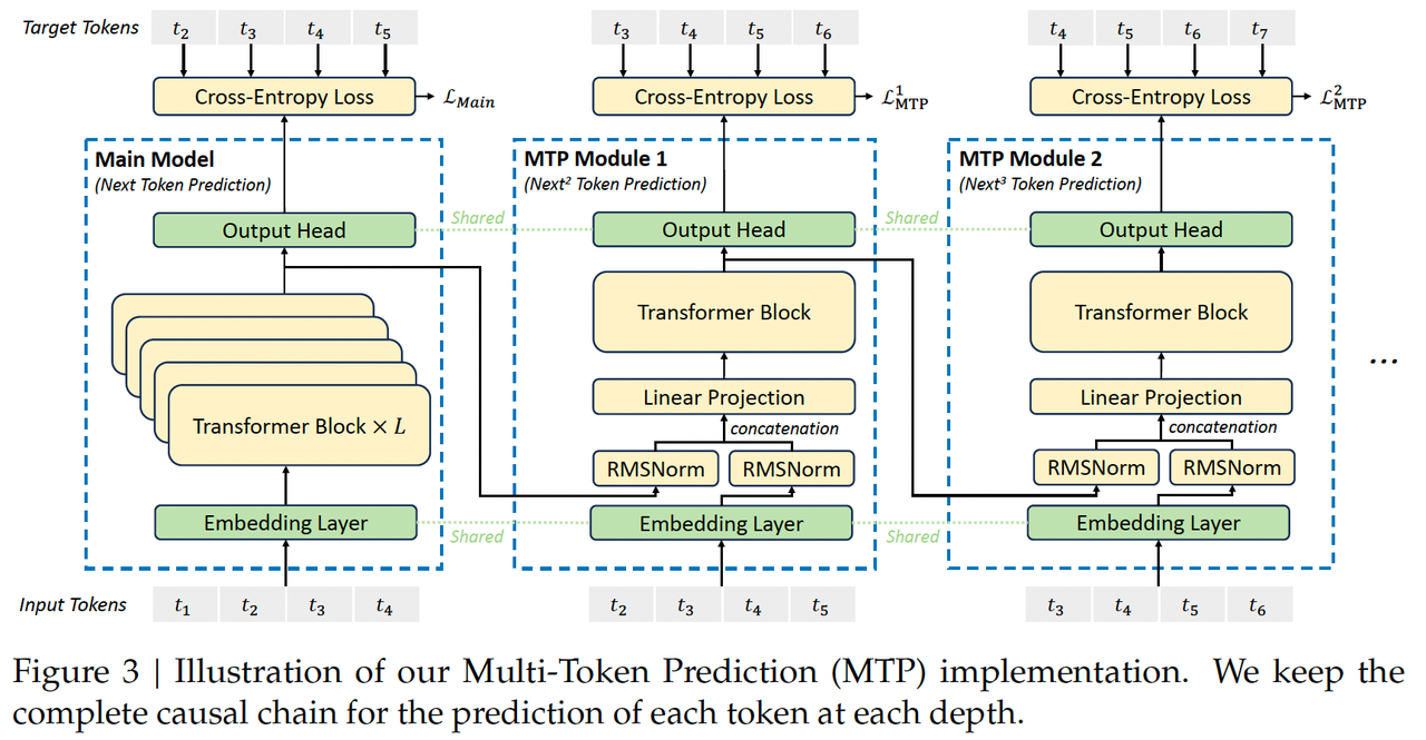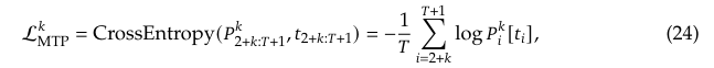 损失计算:对于每个预测深度,计算交叉熵损失,并将所有深度的MTP损失平均后乘以权重因子,得到总的MTP损失: