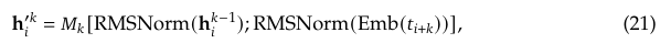 该模块的输入为上一层的输入$h_i^{k-1} \in \mathcal{R}^d$与输入token中的第i+k个token的嵌入$Emb(t_{i+k})\in \mathcal{R}^d$各自经过RMSNorm后的拼接,随后再经过一个线性层得到最终输入。公式如下:![]()