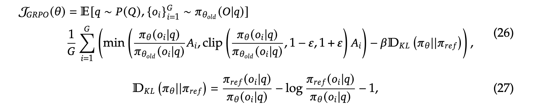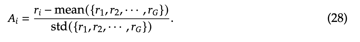 其中,\(\epsilon\) 和 \(\beta\) 是超参数;\(\pi_{\theta'}\) 是参考模型;\(A_i\) 是优势,由每个组内的输出对应的奖励 \(\{r_1, r_2, \ldots, r_A\}\) 计算得出: