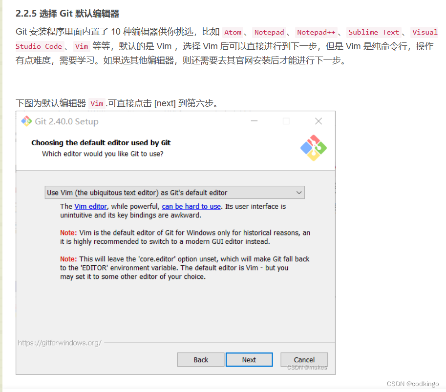 期间会出现这一步骤,作者并没有推荐选择哪一种好。对我自己而言,作为一个新手,我的需求只要能将代码上传到GitHub上即可。所以选择Vim就够用了。