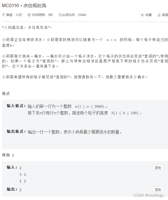 一个典型的dfs题目,只要被访问的元素的高度大于四周元素的高度则深度搜索,直到四周元素的高度都大于被访问元素,或者到达矩阵边界,则停止搜索。