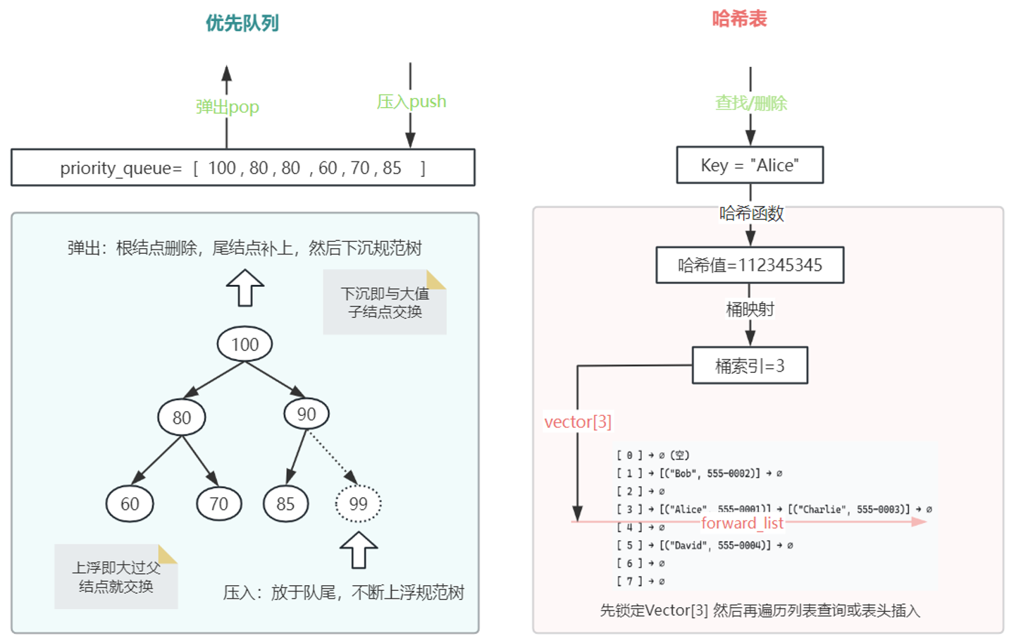 下面我将以序列容器的vector,关联容器的哈希映射,容器适配器的优先队列为例实战