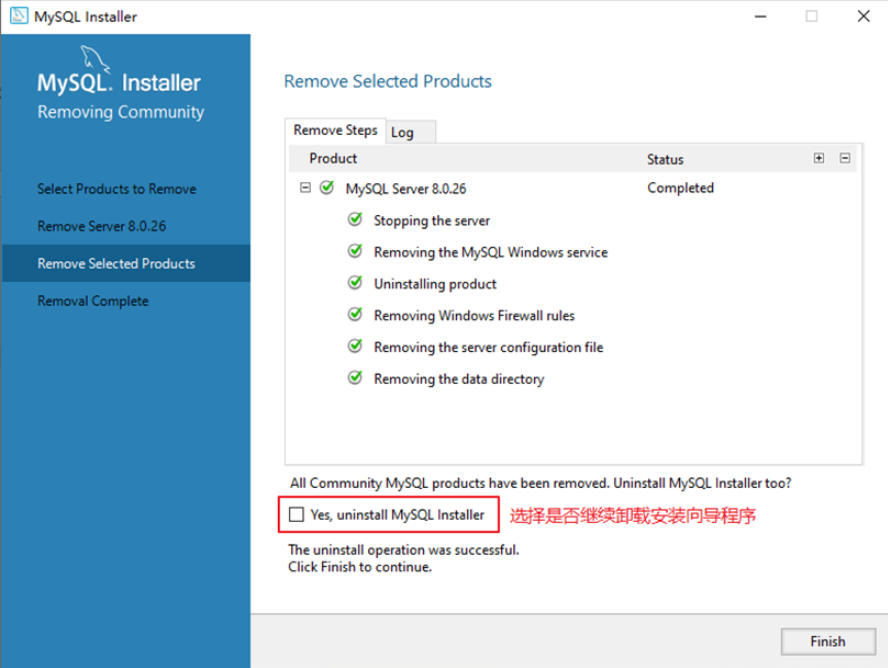 - 完成卸载。单击“Finish”(完成)按钮即可。如果想要同时卸载MySQL8.0的安装向导程序,勾选“Yes,Uninstall MySQL Installer”即可,如图所示。
