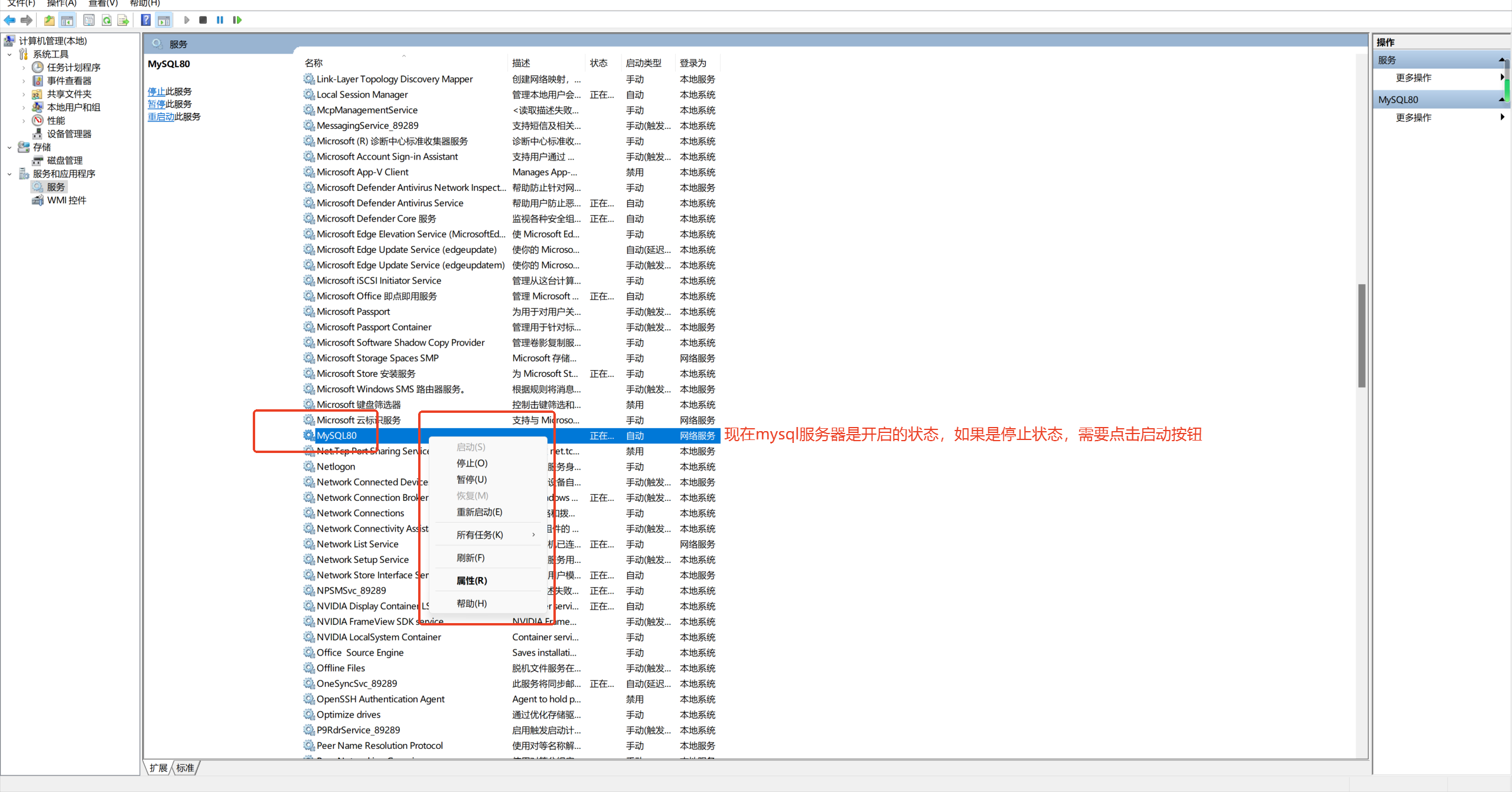 步骤2:找到MySQL80(点击鼠标右键)→ 启动或停止(点击)