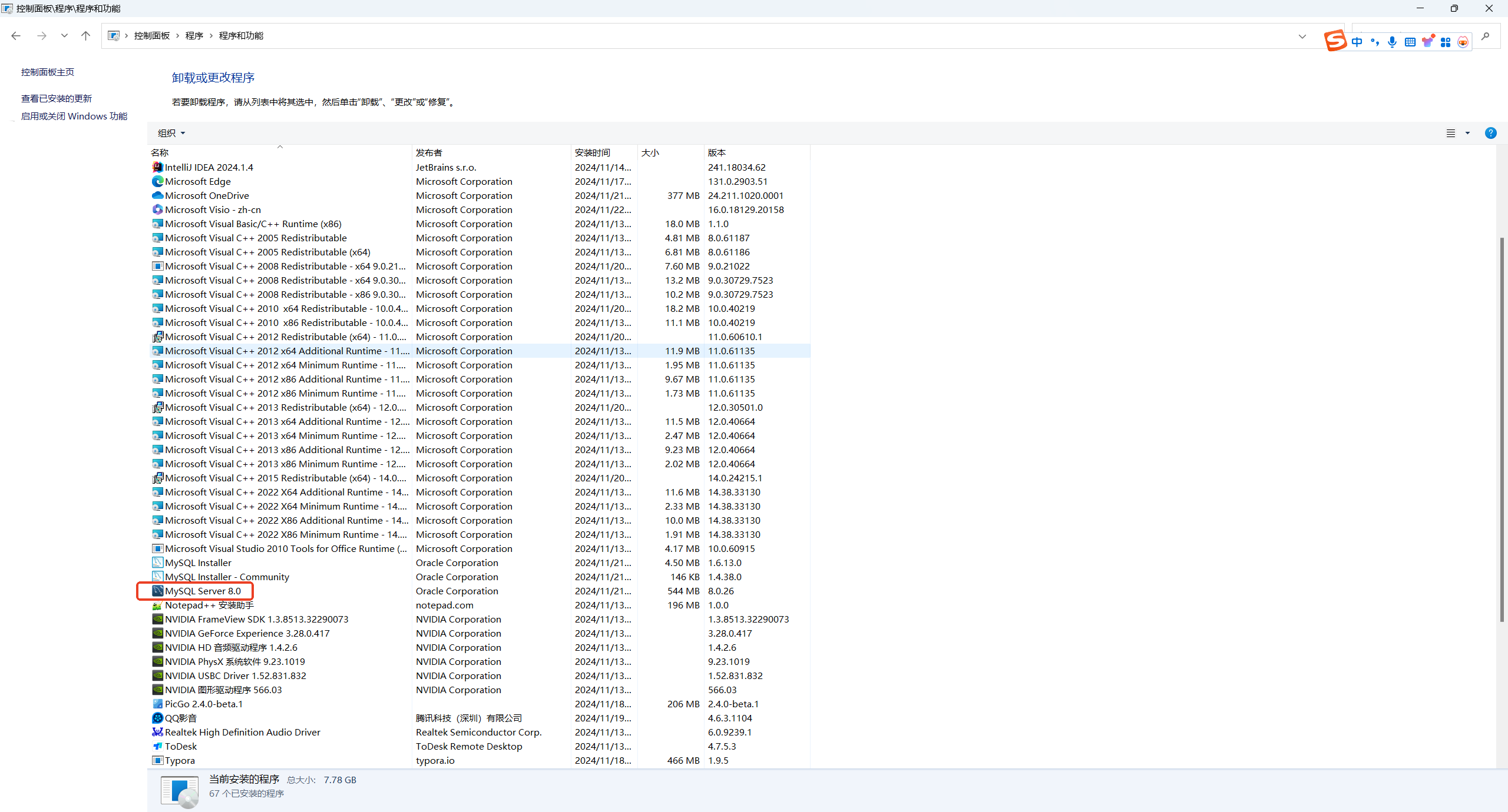 卸载MySQL8.0的程序可以和其他桌面应用程序一样直接在“控制面板”选择“卸载程序”,并在程序列表中找到MySQL8.0服务器程序,直接双击卸载即可,如图所示。这种方式删除,数据目录下的数据不会跟着删除。