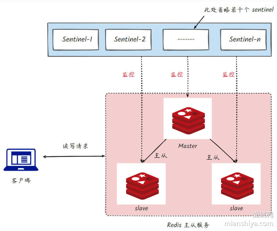 - 哨兵节点(Sentinel): 主要作用是对 Redis 的主从服务节点进行监控,当主节点发生故障的时候,哨兵节点会选择一个合适的从节点升级为主节点,并通知其他从节点和客户端进行更新操作。