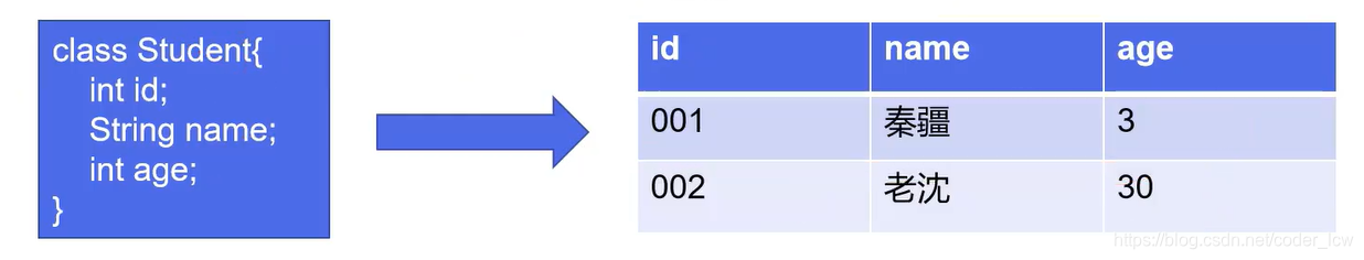 - 类和表结构对应、属性和字段对应、对象和记录对应