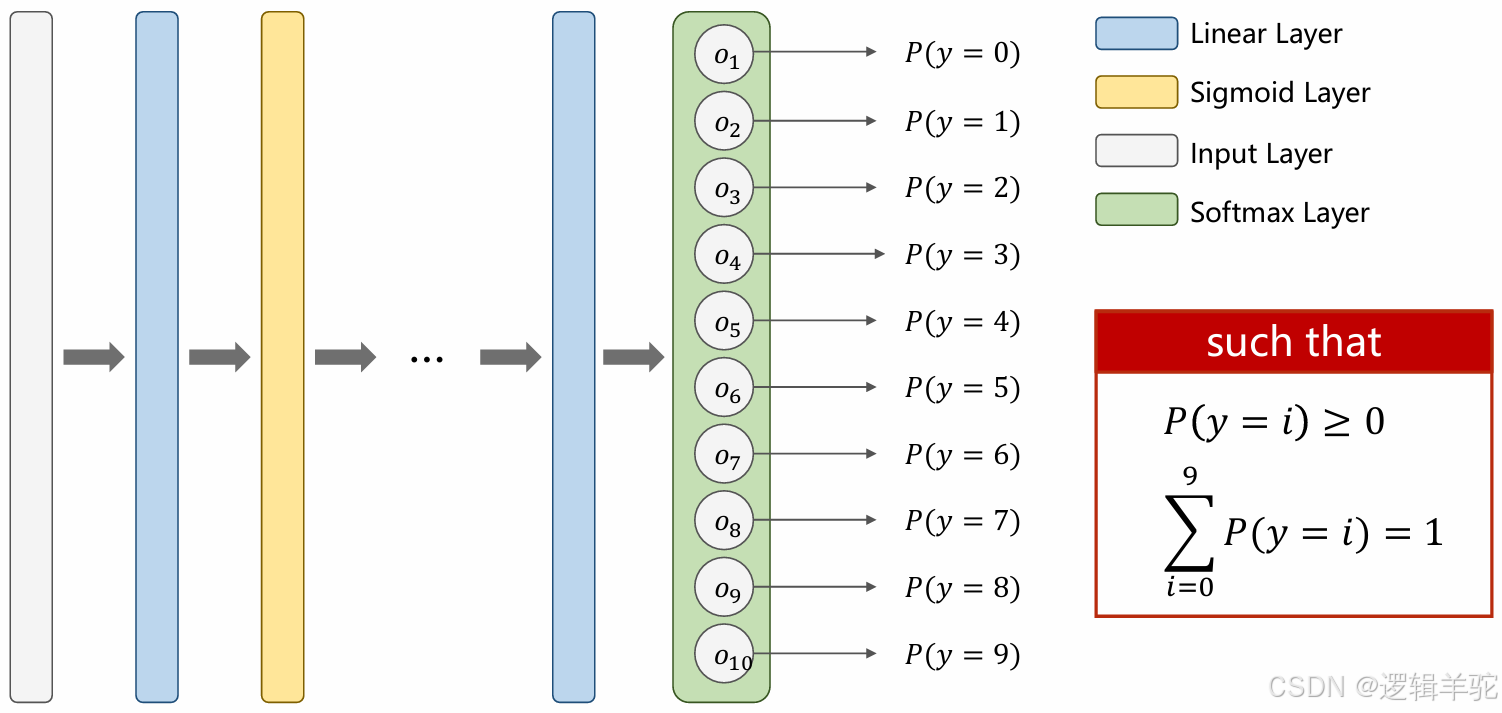 然而,在大多数实际情况下,类别的数量往往不止两个。在多分类场景中,我们通常训练模型来输出样本属于每个类别的概率,然后根据这些概率进行排序,选择概率最高的类别作为模型的输出。如果继续使用二分类问题的线性模型思路,就会遇到问题。例如,如果类别1的概率 y1 是0.8,类别2的概率 y2 也是0.8,而类别3的概率 y3 是0.7,那么在决定样本的最终类别时就会出现矛盾。尽管 y1 和 y2 的概率最高,理论上应该选择这两个类别之一,但 y3 的概率也不低,同样有一定的可能性。这就是问题所在:我们希望模型的输出是一个明确的概率分布,能够反映样本属于各个类别的相对可能性。也就是说,每个类别都有一个对应的概率值,所有概率值之和为1。