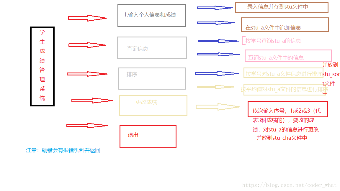 还有一点要注意的是,其余文件都要从stu_a这个文件中读出目录,此时需要多次用到fscanf,有时还有用到fseek去改变文件指针的位置