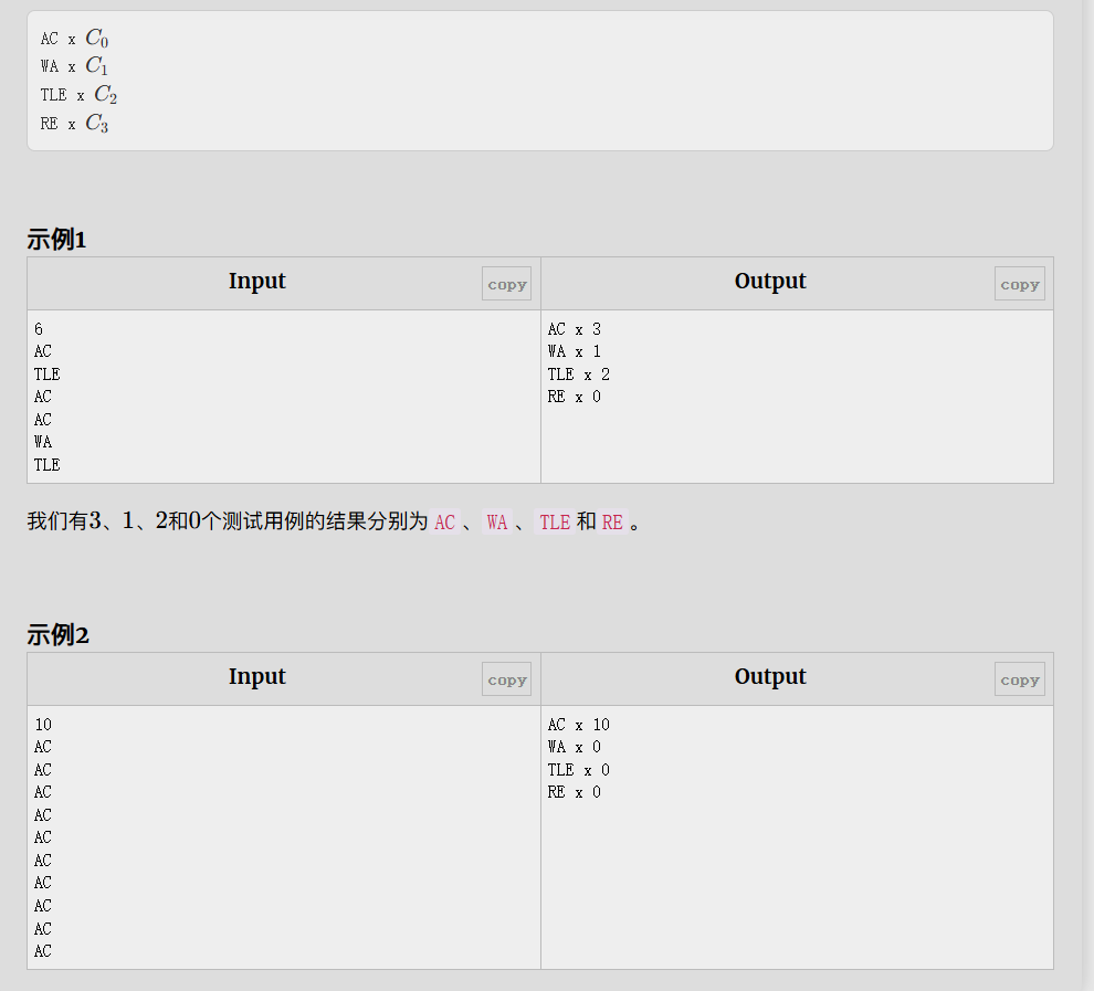 对于每个测试用例ii (1≤i≤N1≤i≤N),你会得到一个代表该测试用例结果的字符串SiSi。找出结果为AC、WA、TLE和RE的测试用例数量。
