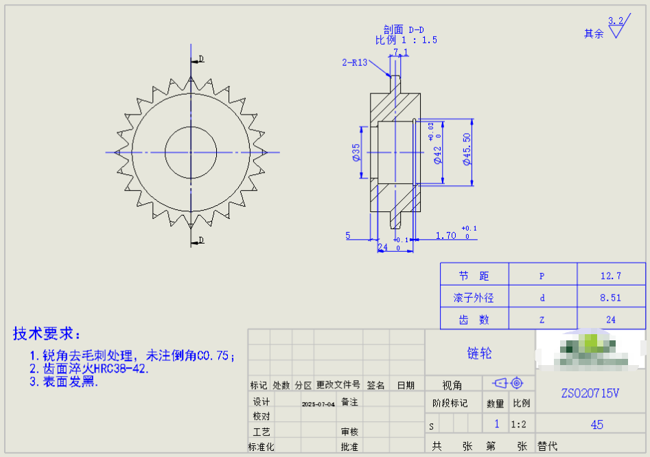 15.链轮工程图,记得加上:节距和齿数,一般处理为45#钢,发黑,齿面淬火hc55-60.
