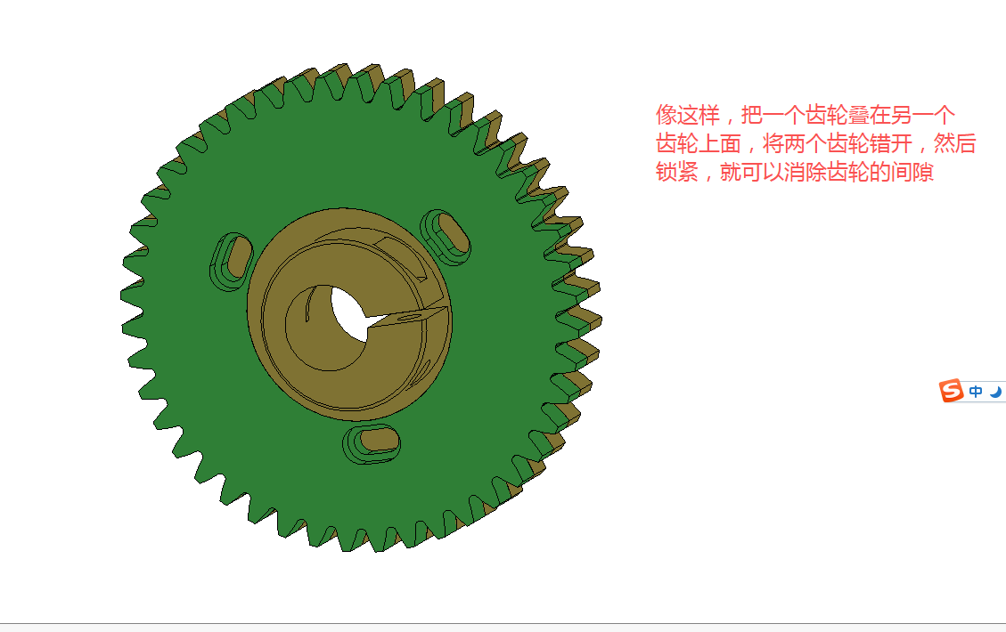 使用错位齿轮,就是把两个齿轮合在一起,把齿错开,这样就可以消除两个齿轮之间的间隙