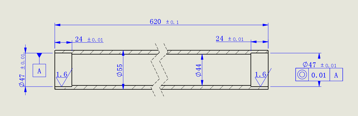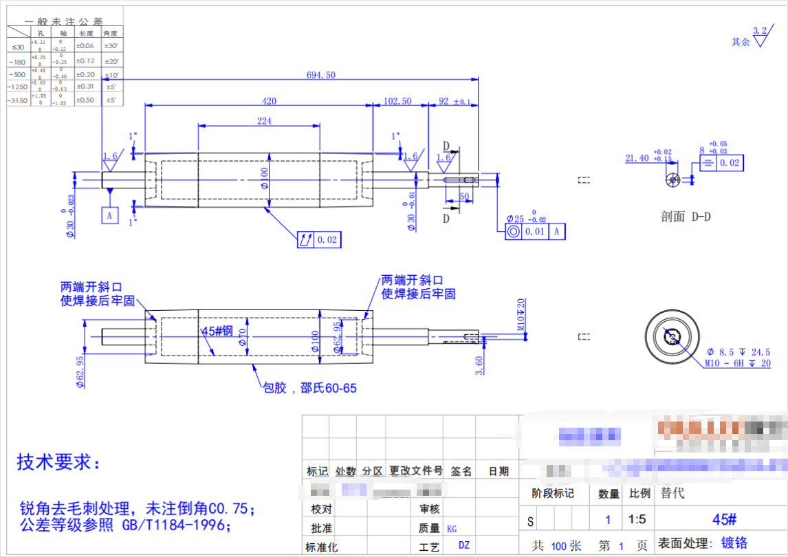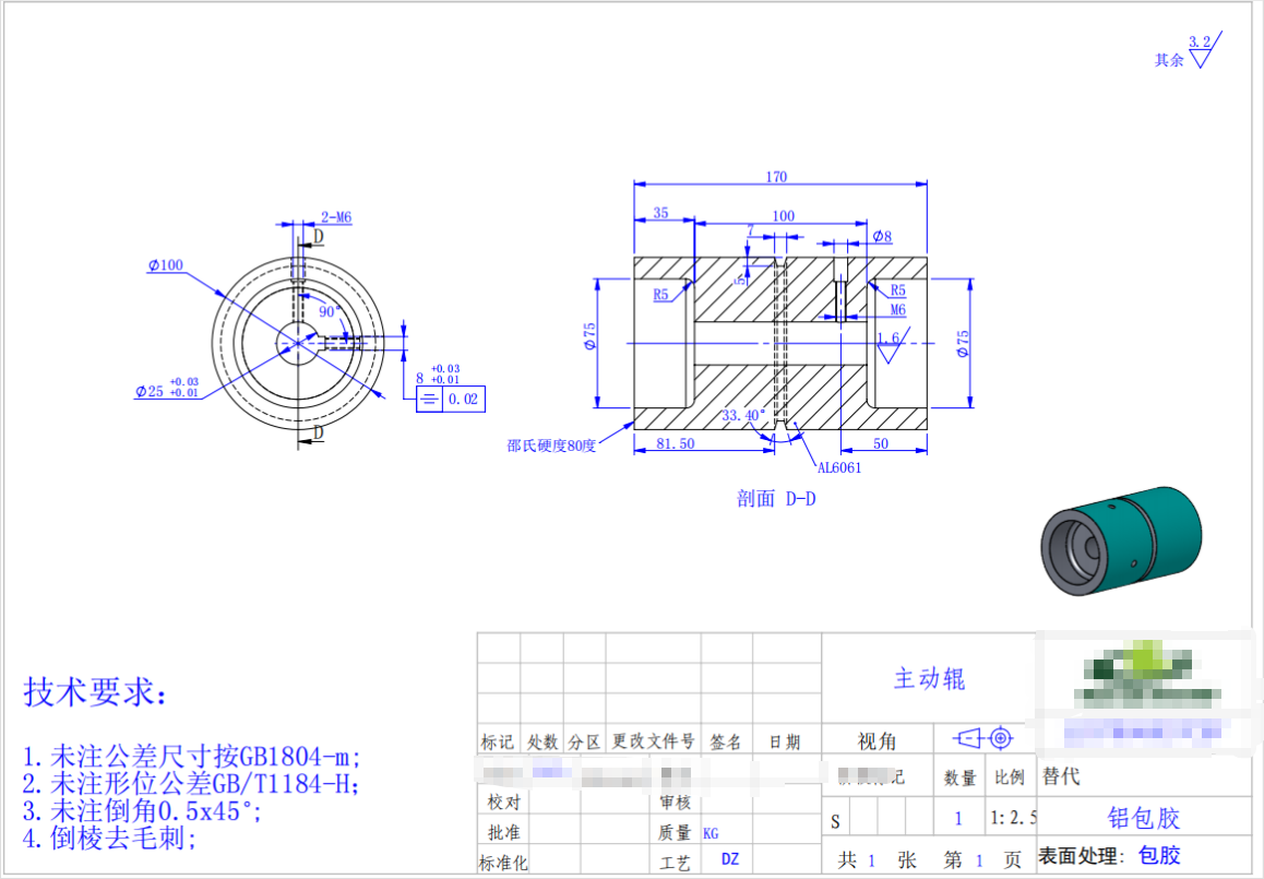24.包胶滚筒怎么制作工程图,注意包胶滚筒是空心管焊接两端制成的,所以我们必须要标注同轴度0.03