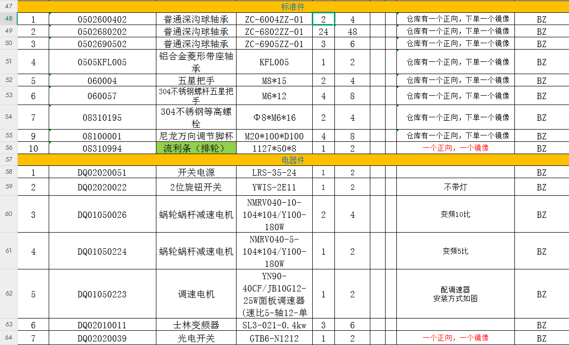 25.标准件都是机械上需要用到的,电器件是和电气工程师沟通得出来的,一般为电机减速机,变频器,接近开关,电眼开关,这些东西,至于空气开关,电线那些东西,都是仓库会自己准备。