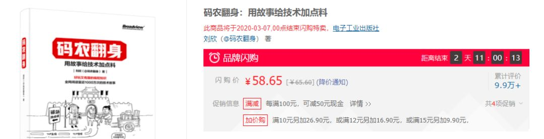 我的书《码农翻身》在京东正在搞品牌闪购,在85折基础上还能享受满100减50的优惠,想买书的朋友赶紧下手吧!3月7号结束,点击阅读原文可直达。
