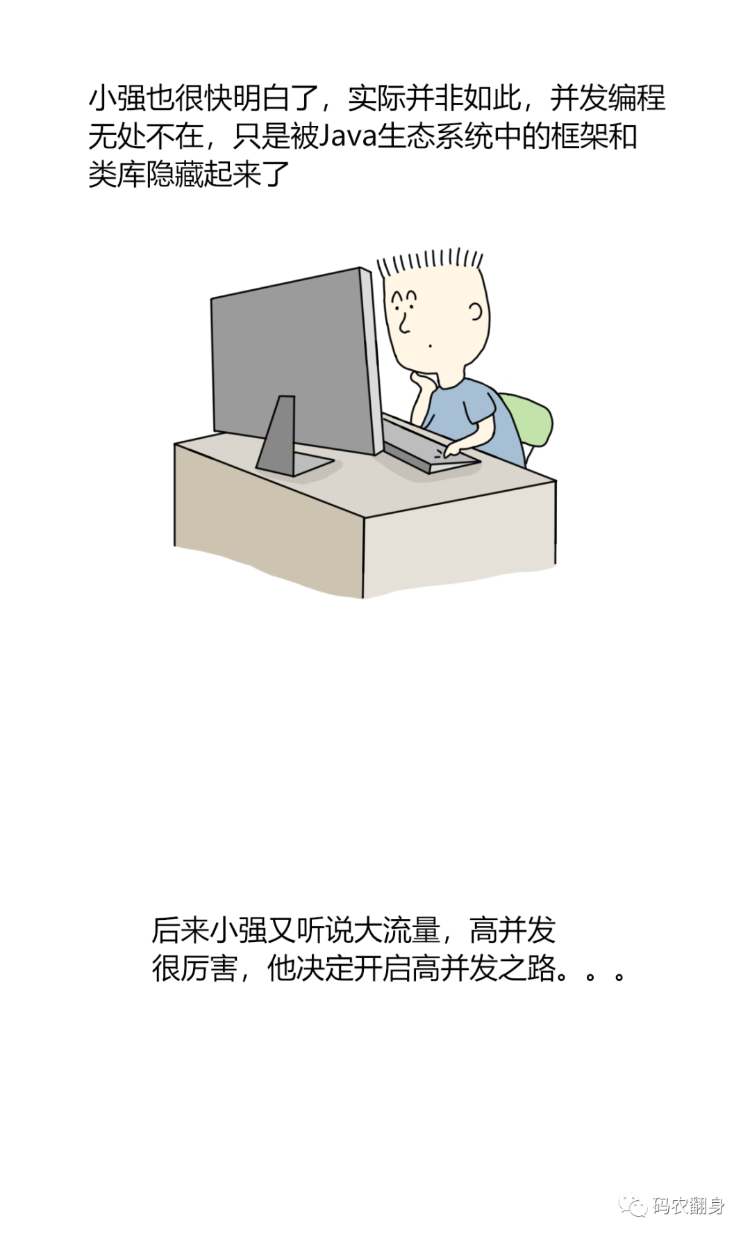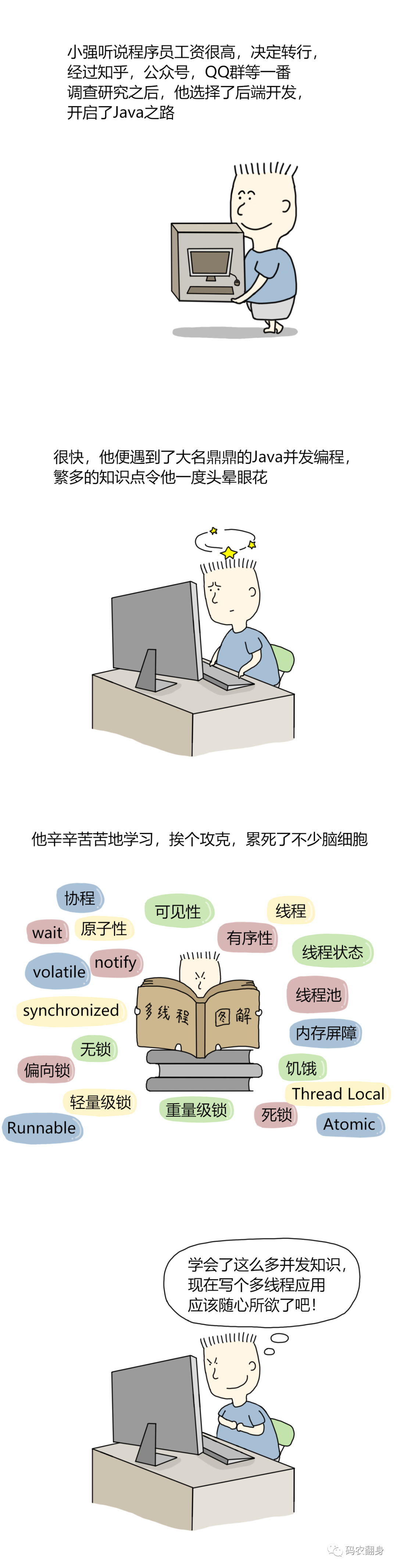 并发编程到底用在什么地方?实际上并发编程是非常难的一件事情,难以编写,难以调试,非常容易出错,没有极高的编程功力是搞不定的。如果每个网络应用程序都让程序员来实现线程之间的通信,同步与互斥,那将是非常痛苦的事情,绝大部分项目都要延期了。所以必须把这个痛点给封装起来,这也是JDK和各大框架如Spring,Netty做的事情,让程序员专注于业务逻辑的快速实现。这就是为什么很多初学者辛辛苦苦地学习了Java并发编程,也背了不少面试题,成功地通过了面试,可是入职以后就发现,根本就用不上,每天做的事情还是增删改查。 如果你将来不开发框架和类库,那大概率遇不到底层的并发编程,但是这些知识对于理解系统的运作,查找问题,仍然大有好处,所以还是得学。