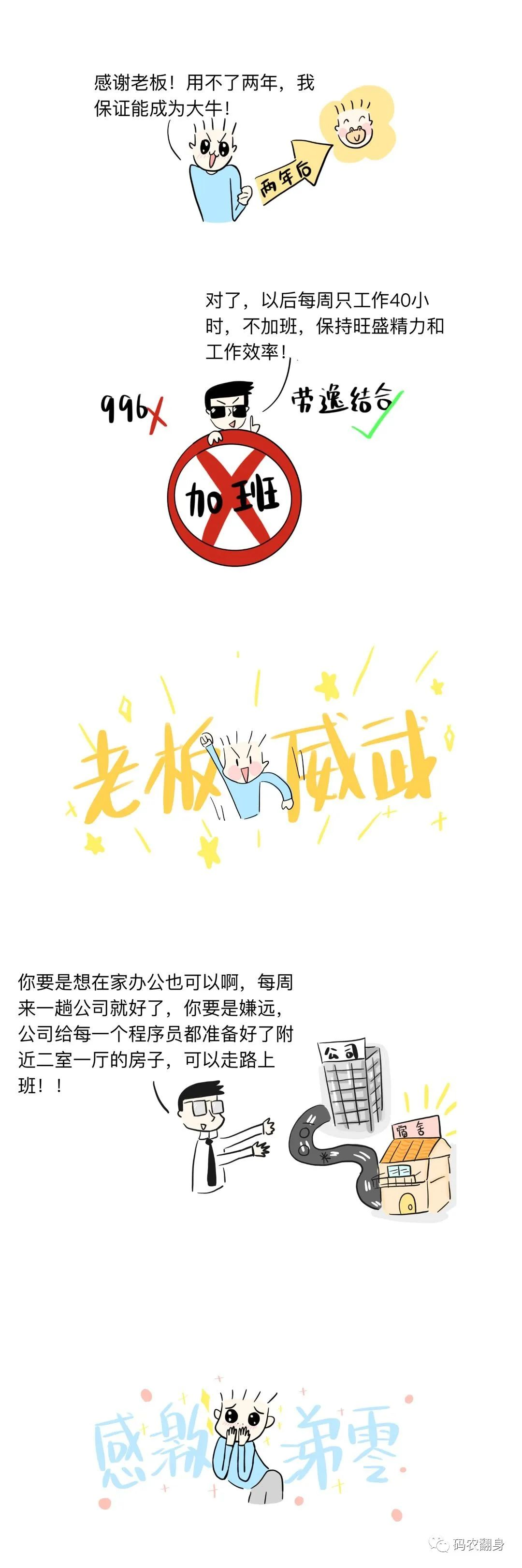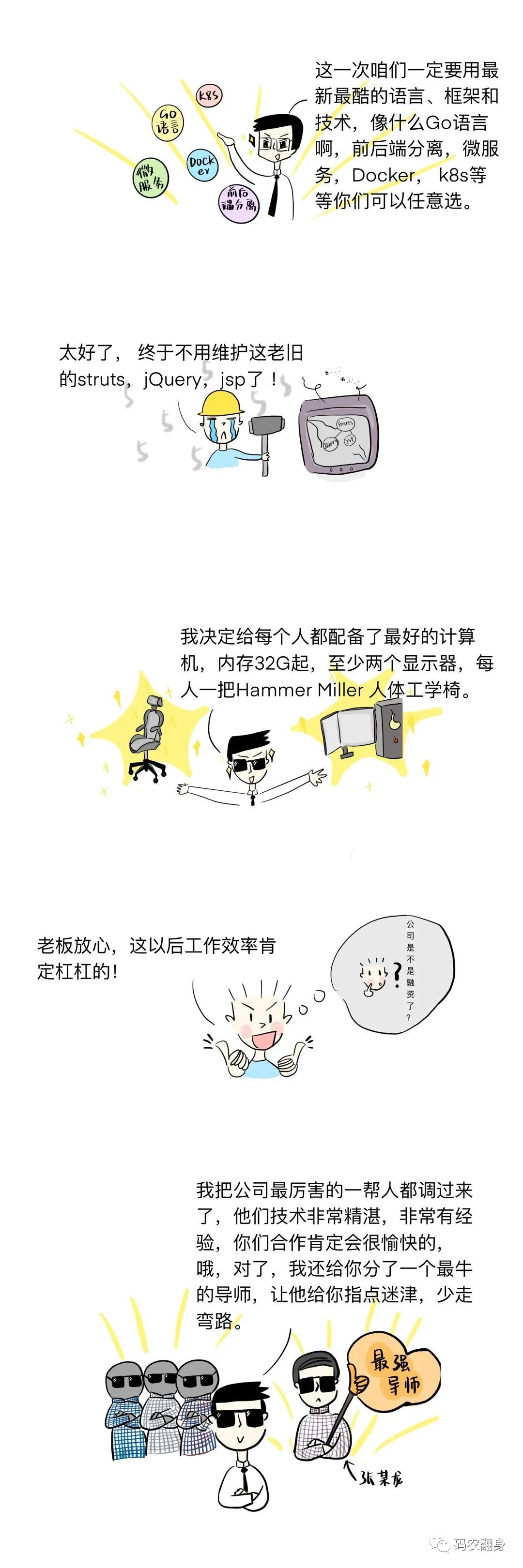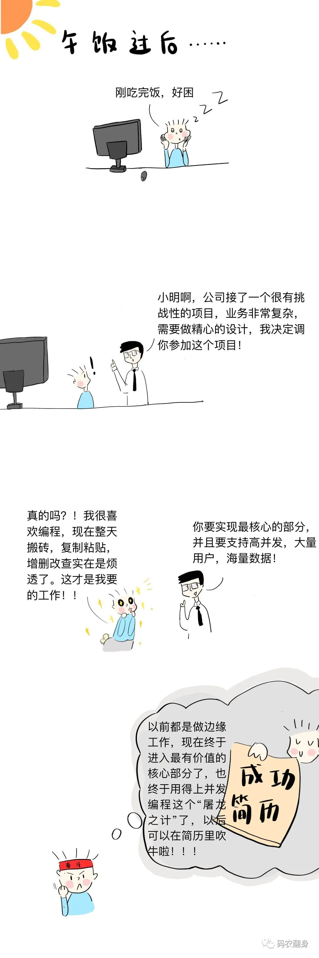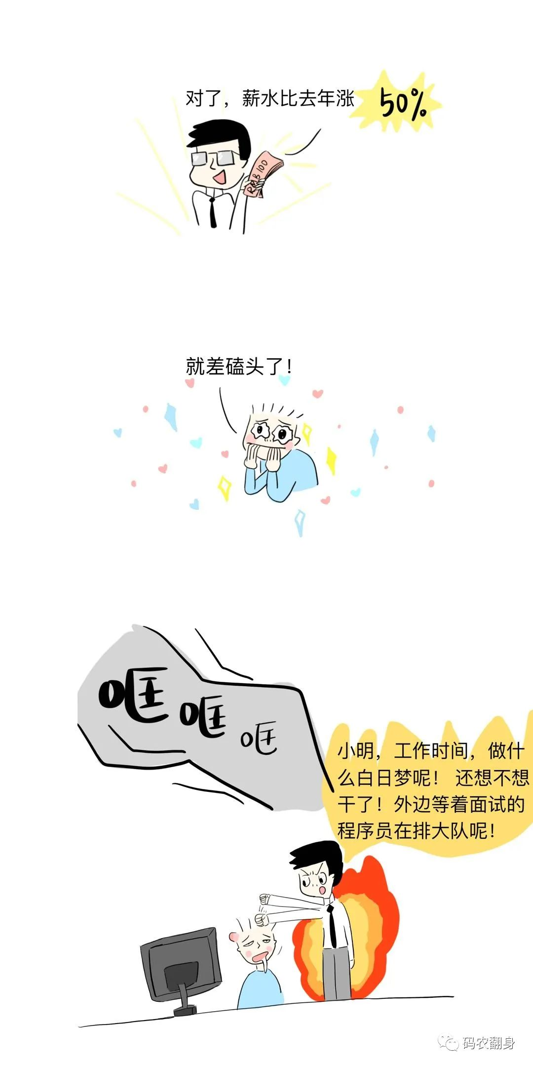 后记:这篇漫画的灵感来自于和我聊过天的很多网友,因为很多人都在吐槽这个行业和自己的工作,整天搬砖,复制粘贴,增删改查实在是烦透了,做得都是边缘的工作,没啥核心技术,并发编程用不上,时下流行的技术也用不上,整天面对的都是一些遗留系统,需求还天天变不说,还要求马上上线,导致加班非常频繁。没有大牛带,自己一个人慢慢摸索,像没头苍蝇一样乱撞。上班单程一个半小时,大好年华都浪费在路上了,然后还要面对35岁问题。