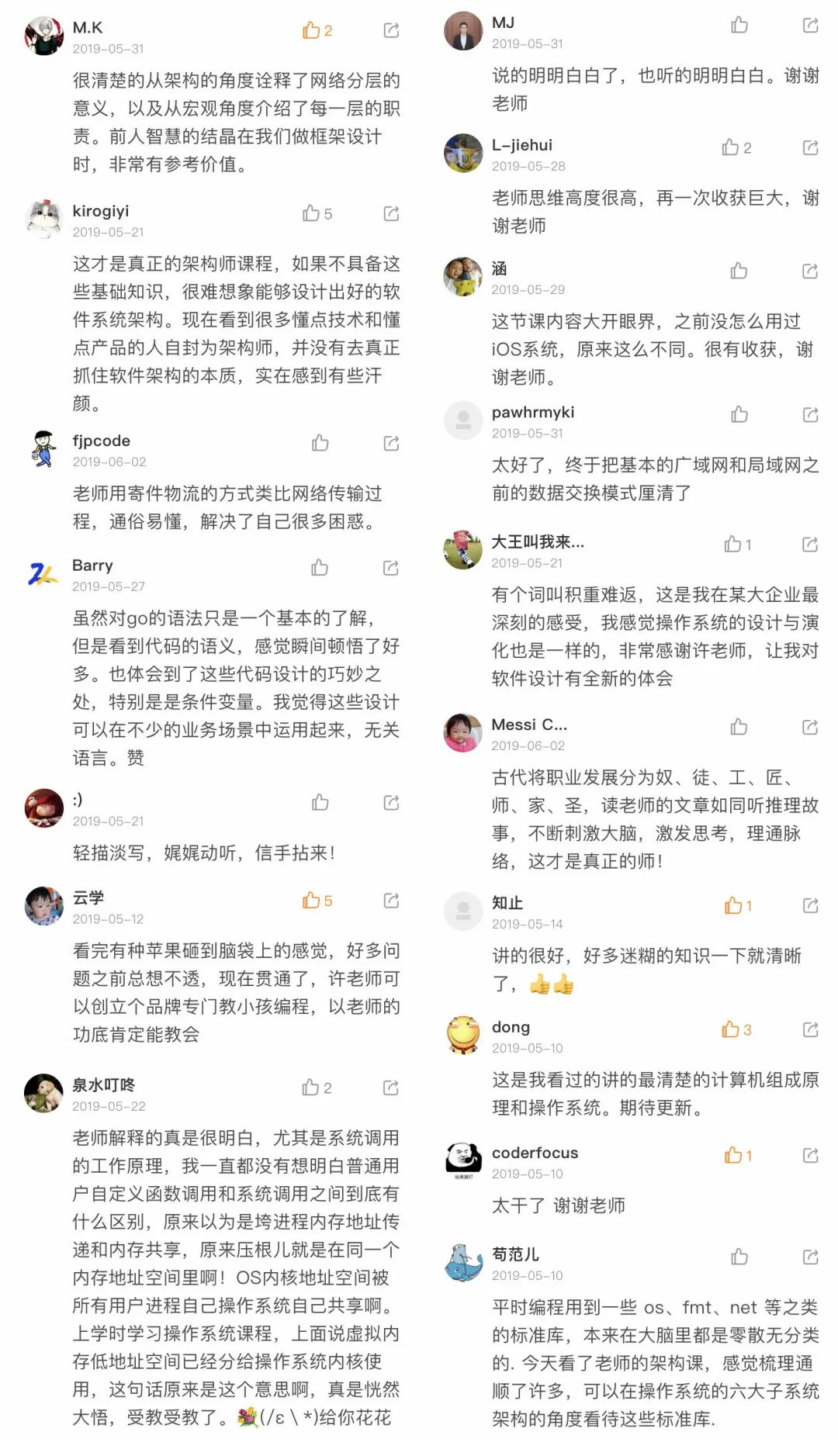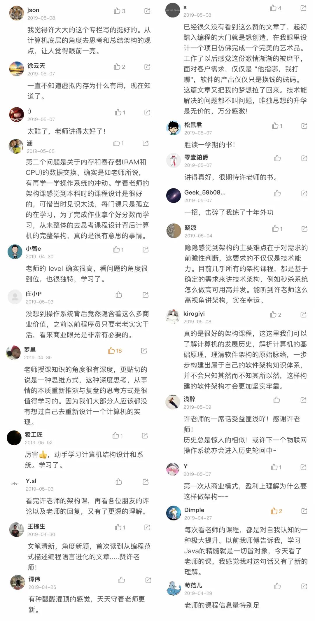 去年追着更新看了一遍,今年抽空又二刷了。如果用四个字概括这个专栏,我觉得是:高屋建瓴——既有架构观,也有方法论,结合老许 20 年经验沉淀,可以说是始于架构,又高于架构。