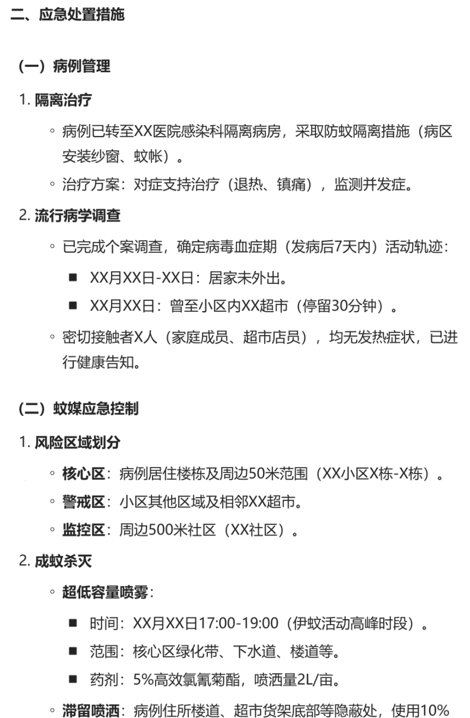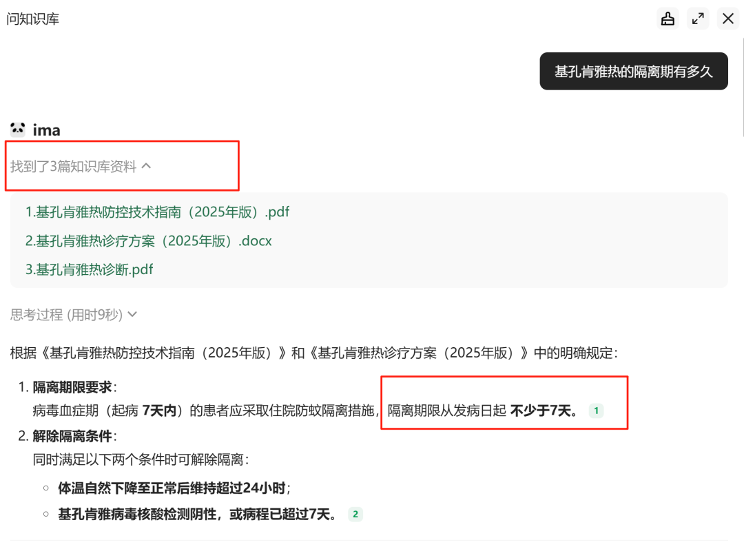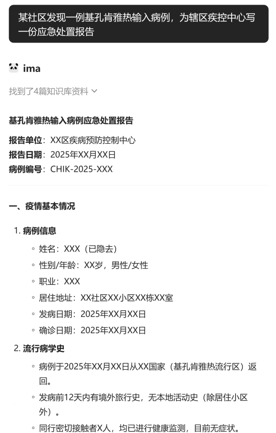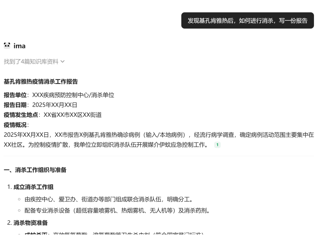 例如我可以让它写一份报告:“某社区发现一例基孔肯雅热输入病例,为辖区疾控中心写一份应急处置报告”,ima很快搞定,涵盖了疫情基本情况,应急处理措施,灭蚊措施等等,可以看出它是从知识库的多个文档中提取相关信息,综合形成了这个报告,报告很全面,非常方便。