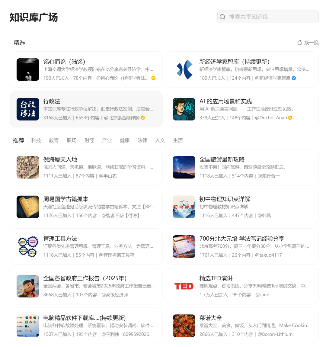 被发布的知识库会进入知识库广场,这里有海量的优质知识库供大家使用,涵盖医疗、科技、教育、财经、产业,简直就是一个大宝库。