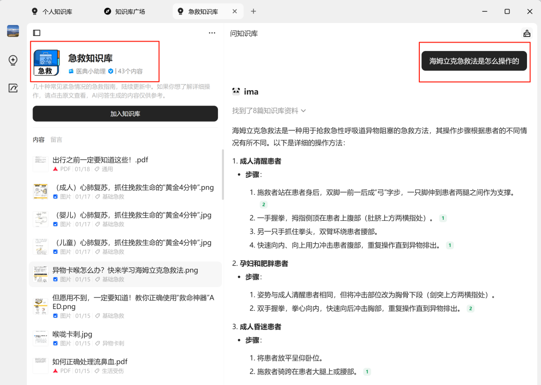 对知识库广场的每个知识库,都可以进行查询和搜索,比如我加入了一个“急救知识库”,问了问“海姆立克急救法是怎么操作的”,回答得相当不错。