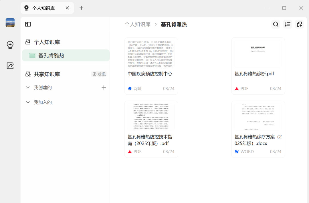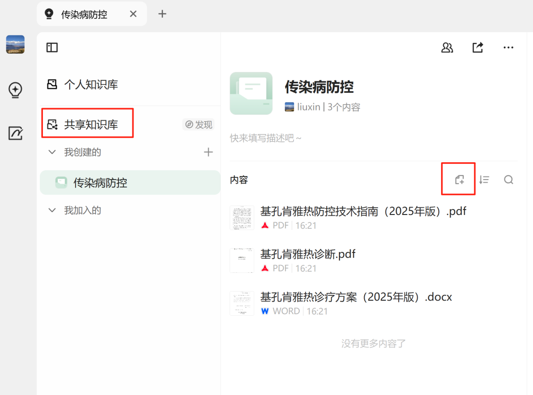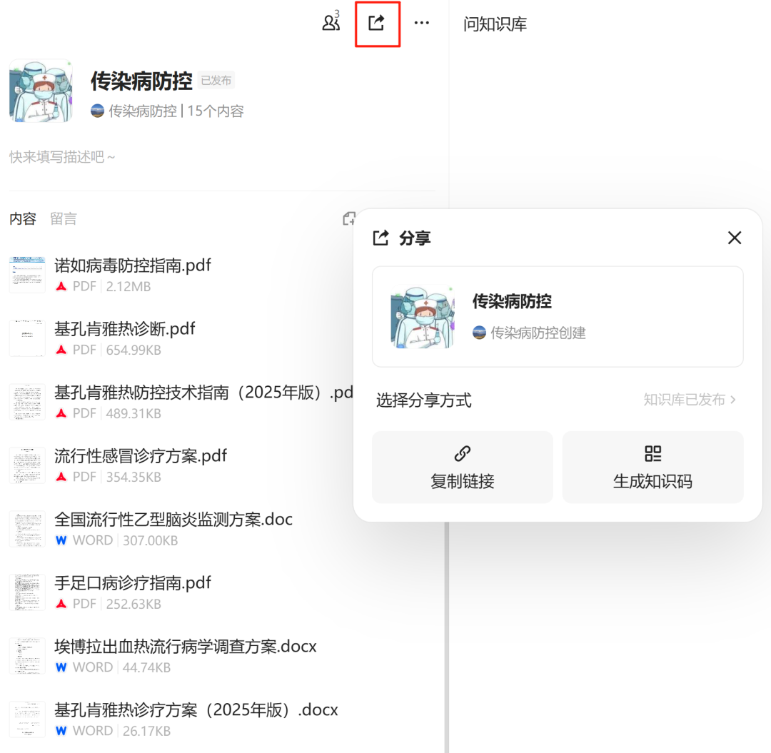 创建一个共享知识库“传染病防控”,把文件添加进去: