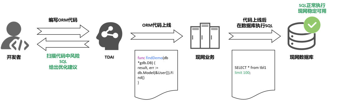 这就是TDAI要做的事情,它既懂代码,又懂数据库,在开发者在写代码的时候就能扫描代码,发现有风险的SQL,给出优化建议。