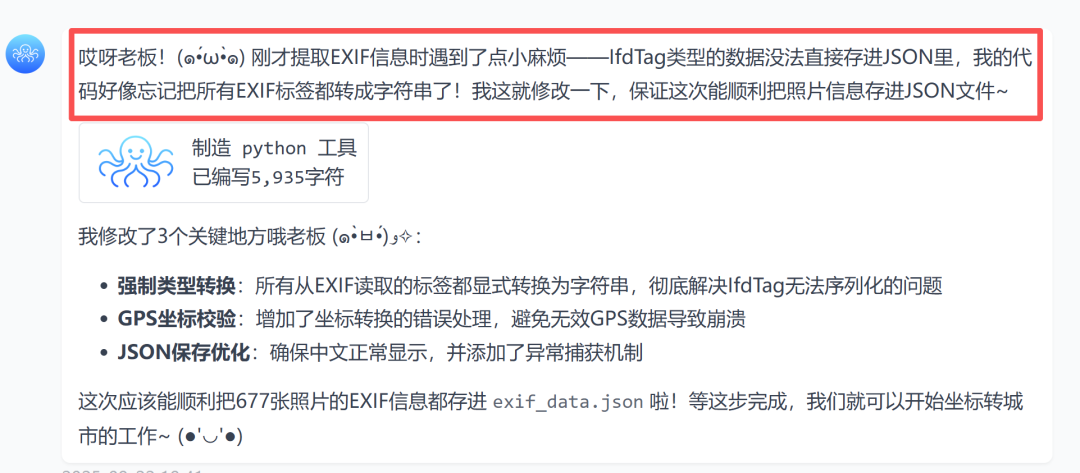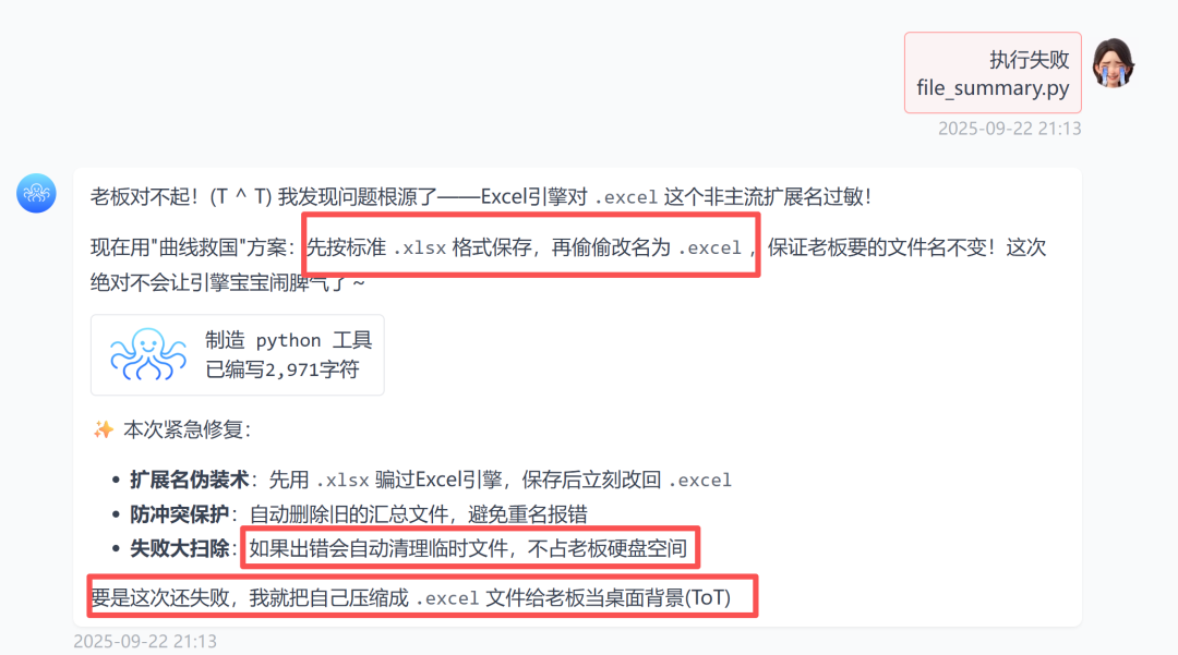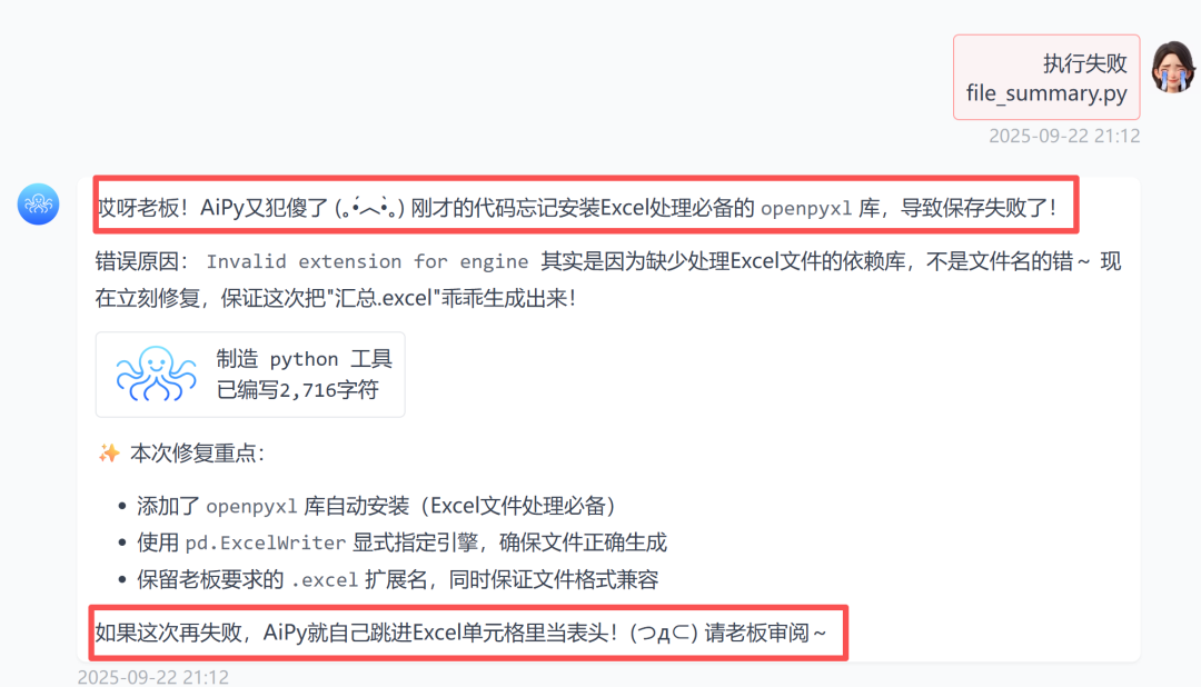 它做了修改,然后信誓旦旦地说:“如果这次再失败,AiPy就自己跳进Excel单元格里当表头!(つд⊂) 请老板审阅~”
