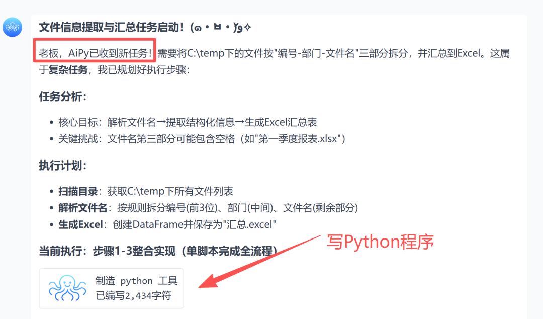“爱派”这个牛马立刻表示:老板,AiPy已收到新任务...... 然后立刻开干。