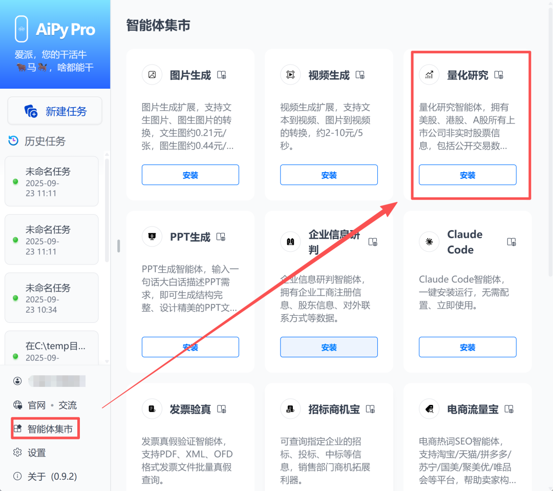 在“智能体集市”中有个叫做“量化研究”的智能体,拥有美股、港股、A股所有上市公司历史股价数据,包括公开交易数据、财务数据等。
