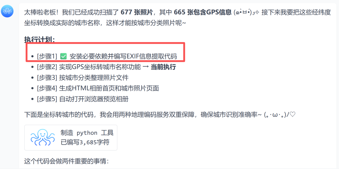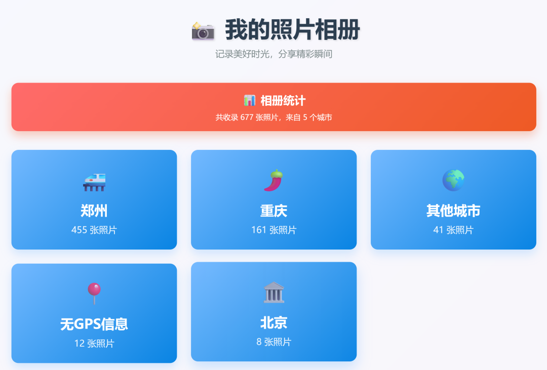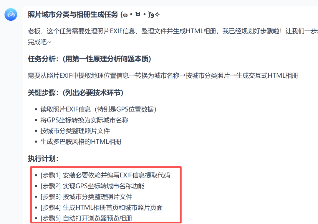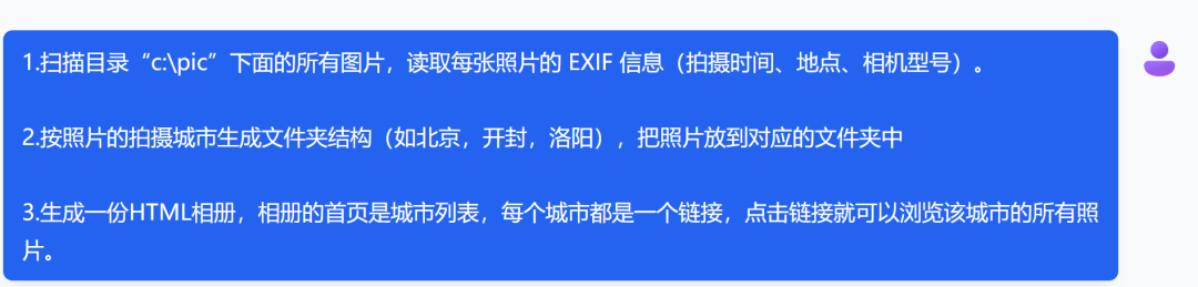 前面的需求还比较简单,接下来给它一点儿挑战,让它帮我整理电脑上的照片,按拍摄城市分门别类存放,然后创建一个HTML的相册。