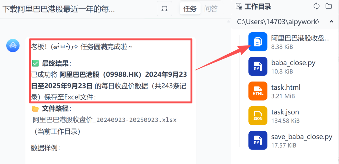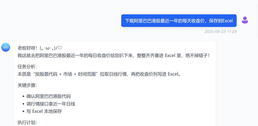把它安装好以后就可以吩咐它来干活了,比如:下载阿里巴巴港股最近一年的每天收盘价,保存到Excel。