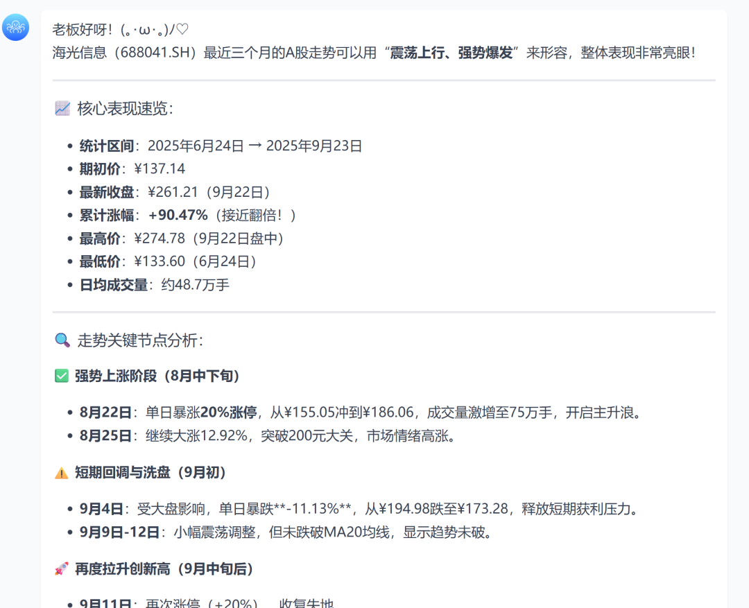 接下来我让它分析一下一只股票的走势,“爱派”不但给出了“核心表现速览”,还给出了走势关键节点分析,技术指标信号,相当不错!