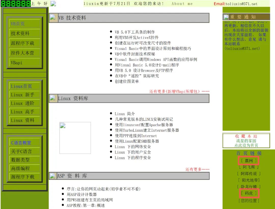 反观我自己,建立个人网站就是脑袋一热,觉得自己学计算机的,那就搞个技术的网站,讲C语言,讲VB,讲Linux......