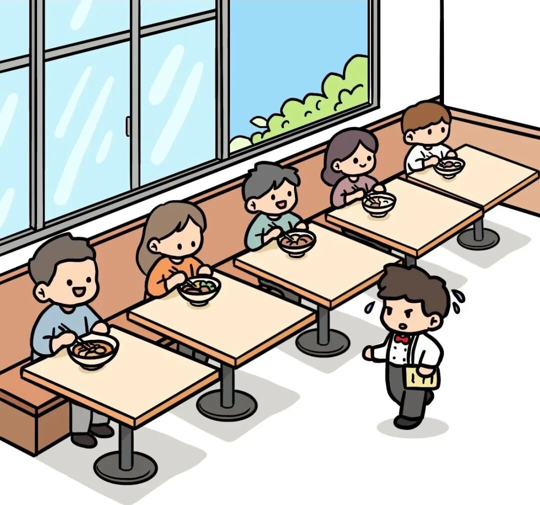 由于后厨做菜需要很长时间,店小二就在客人的旁边等着。