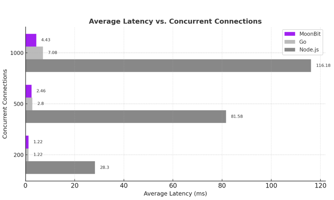 在高并发场景下,MoonBit 的平均延迟始终保持在个位数毫秒,即便在 1000 个连接时也只有 4.43ms;相比之下,Node.js 延迟超过 116ms。这意味着 MoonBit 的异步运行时能够在大规模连接下依然保持快速响应。