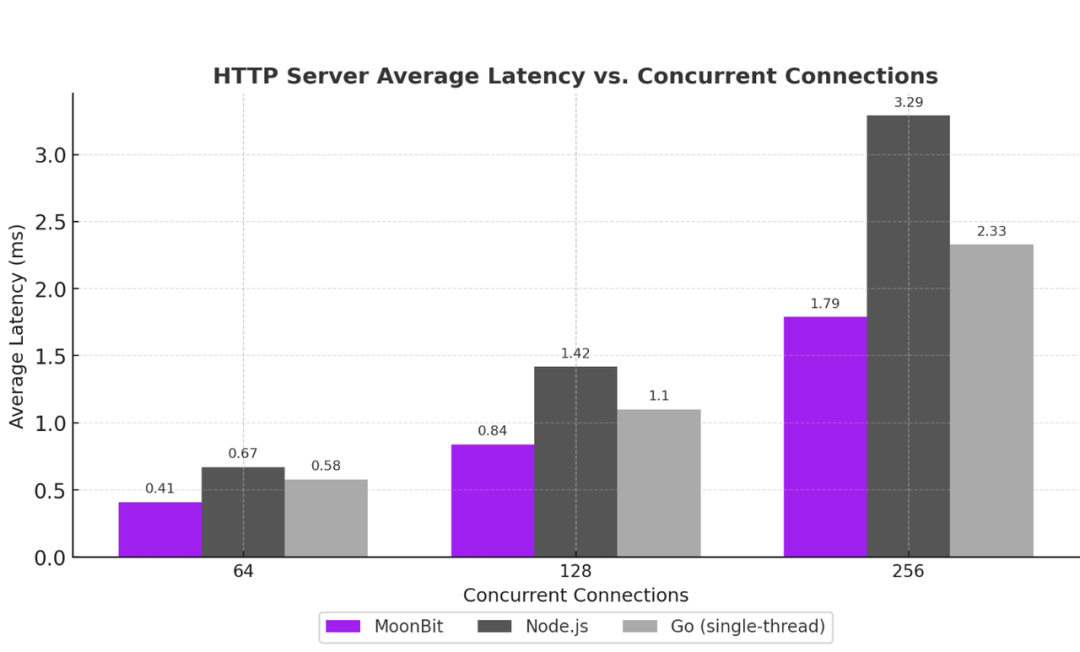 测试结果显示,MoonBit 在 200 到 1000 个并发连接下始终保持最高吞吐量,在高并发场景中明显优于 Node.js 和 Go。这表明其异步运行时具备出色的扩展性。