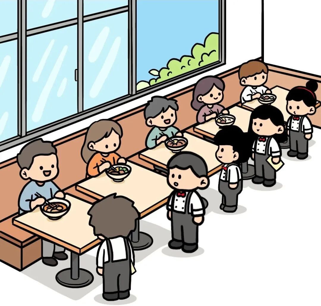 你接受了教训,开了一家新饭店,这次只雇佣了一个店小二,他的工作方式和之前大相径庭: