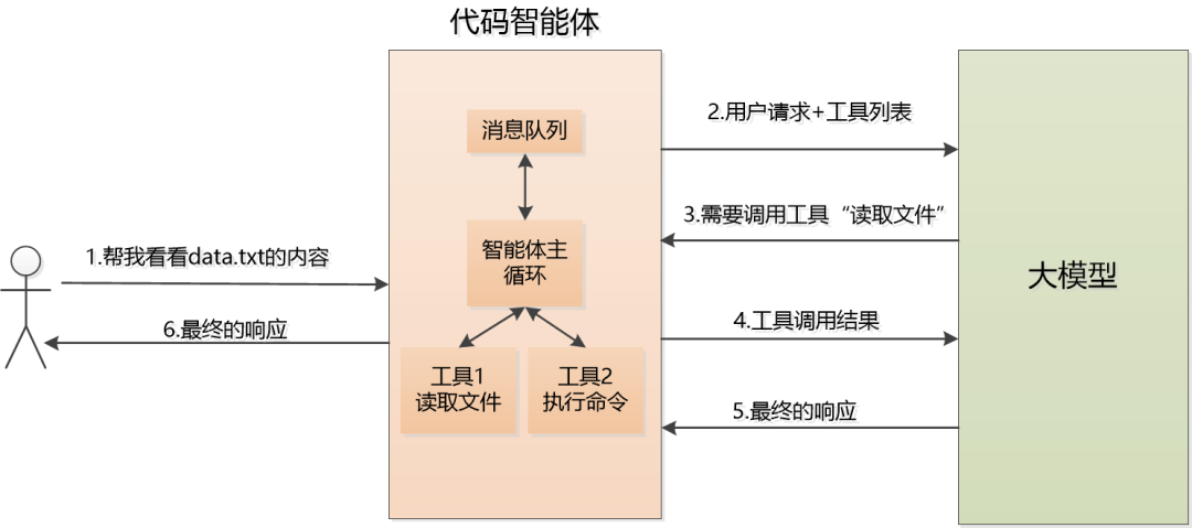 智能体会将结果包装成消息,发送给大模型模型,大模型收到工具返回的内容后,会判断:“我已经得到了文件内容,不需要再调用工具了,我可以生成最终回答”