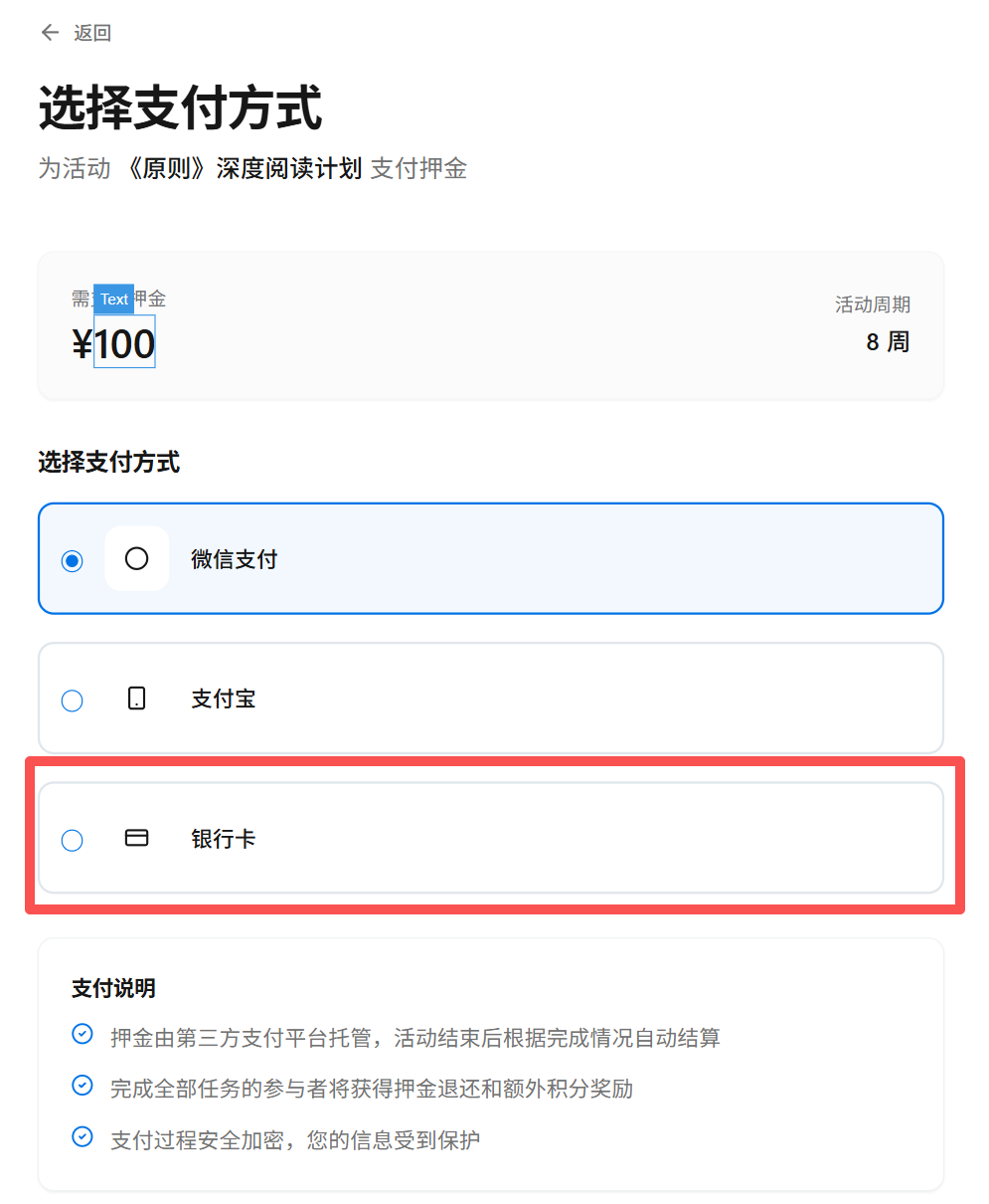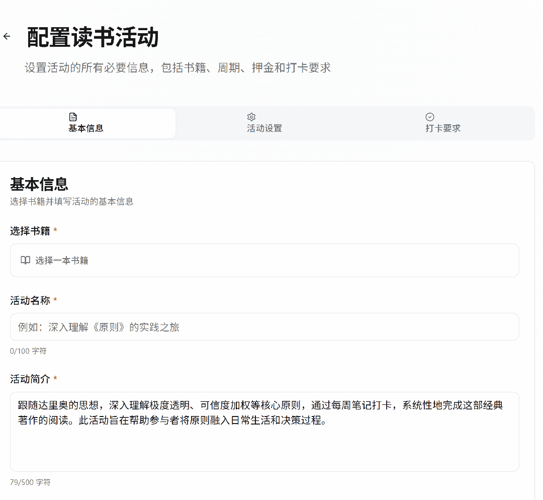 我之前曾经手工管理过一个组队读书的活动,基本的规则是这样的:发布一本书的读书活动,设定多少周读完,参与者需要缴纳押金加入,每周需要提交一篇读书笔记,活动结束退还押金,当然,连续2周都没提交的笔记人,押金被用来给大家发红包。