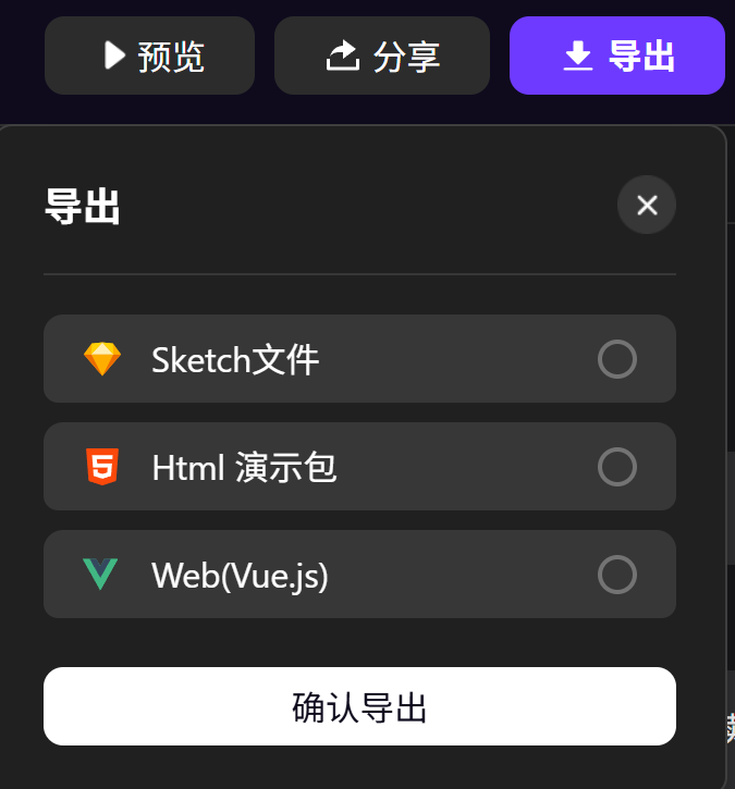 项目导出的时候,支持导出成HTML、Sketch文件、Web。