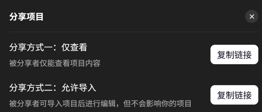 分享的功能也比较直观,可以让别人查看你的项目,也可以让别人导入你的项目。