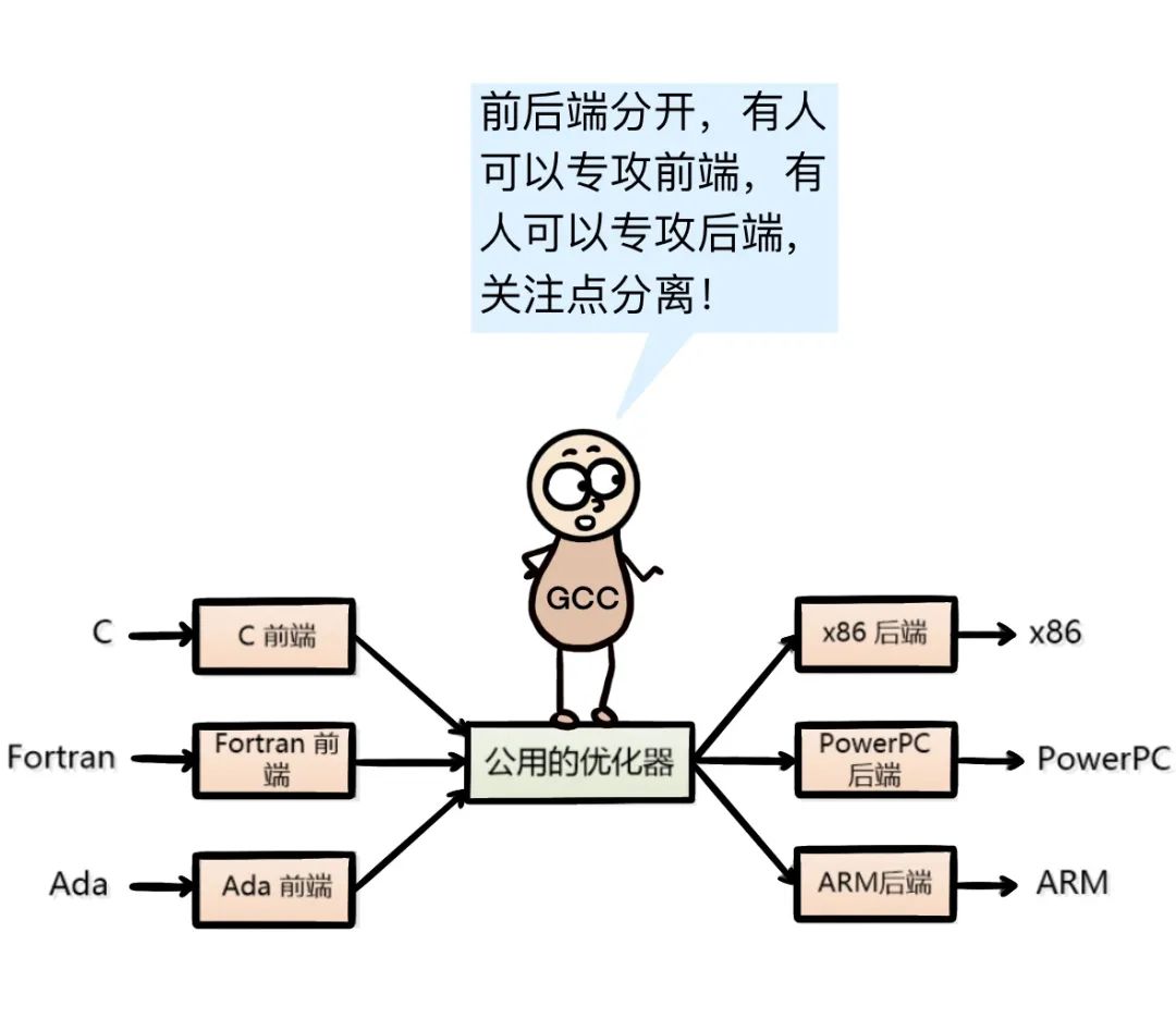 对一个公司来说,当它开发一个编译器的时候,很少投入资金研发多种前端和后端,这就导致无法通用,无法共享。