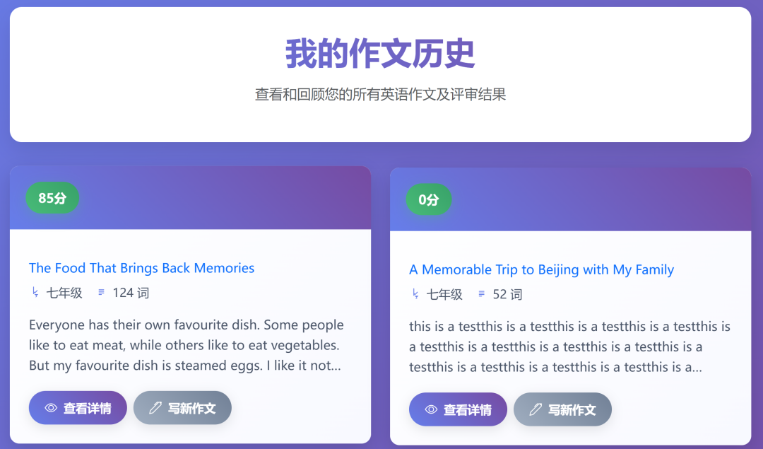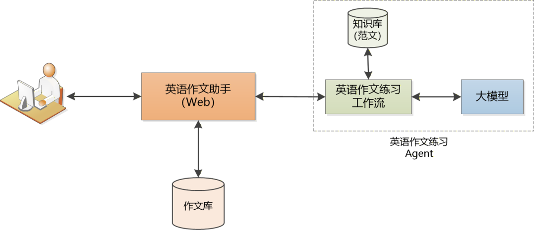 Web系统实现用户界面,调用Agent提供的接口,并且负责保存作文练习的历史记录。