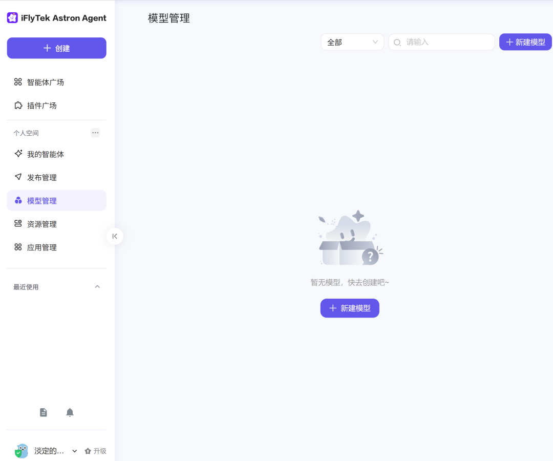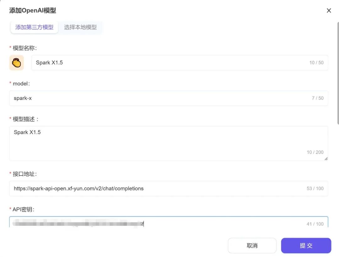 刚开始的时候没有大模型,可以到讯飞星辰 MaaS 平台上申请一个有免费额度的,然后添加到本地: