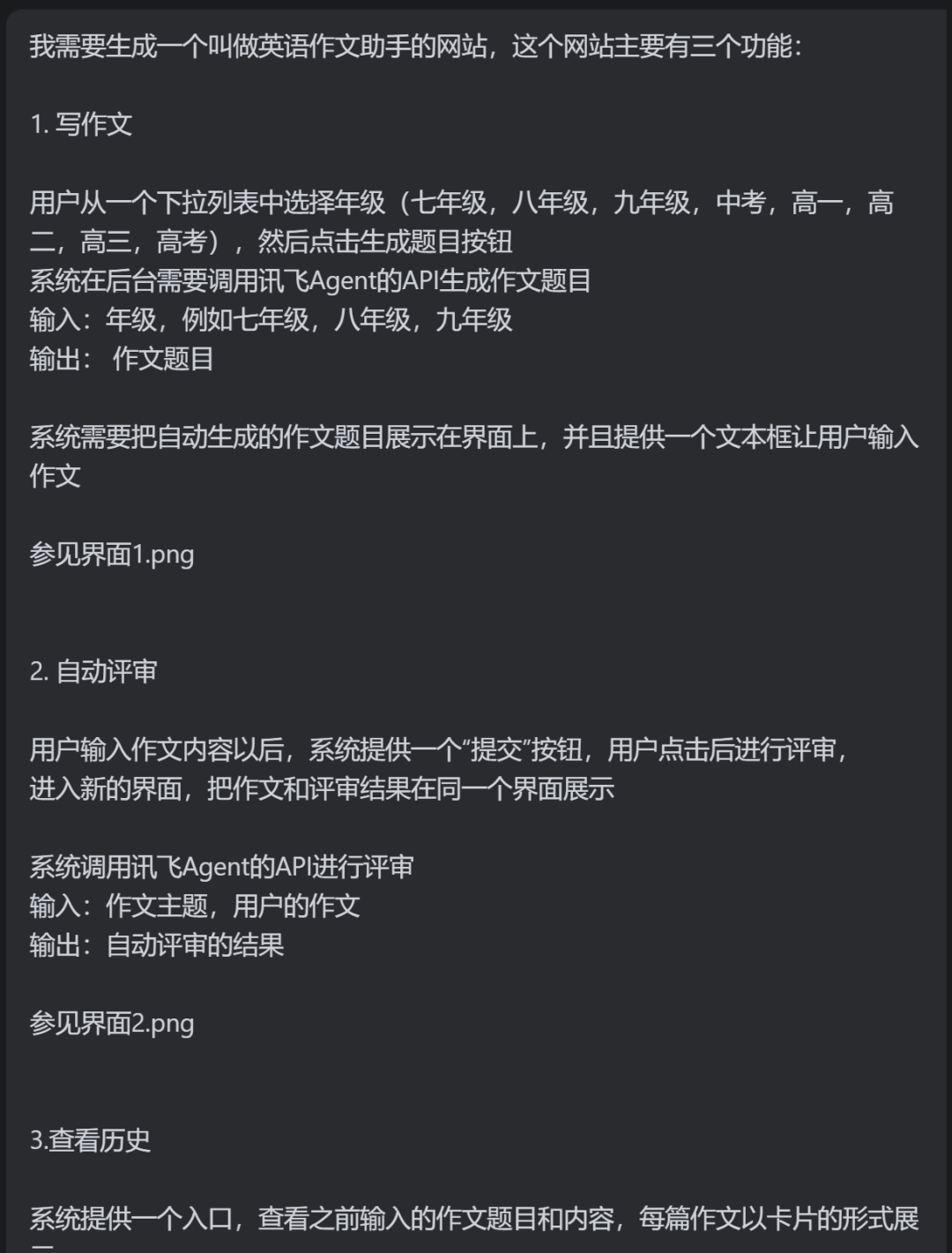一会儿功夫,这个系统就生成了,我手动调整了几处和讯飞AgentAPI调用的代码,系统就运行起来了。