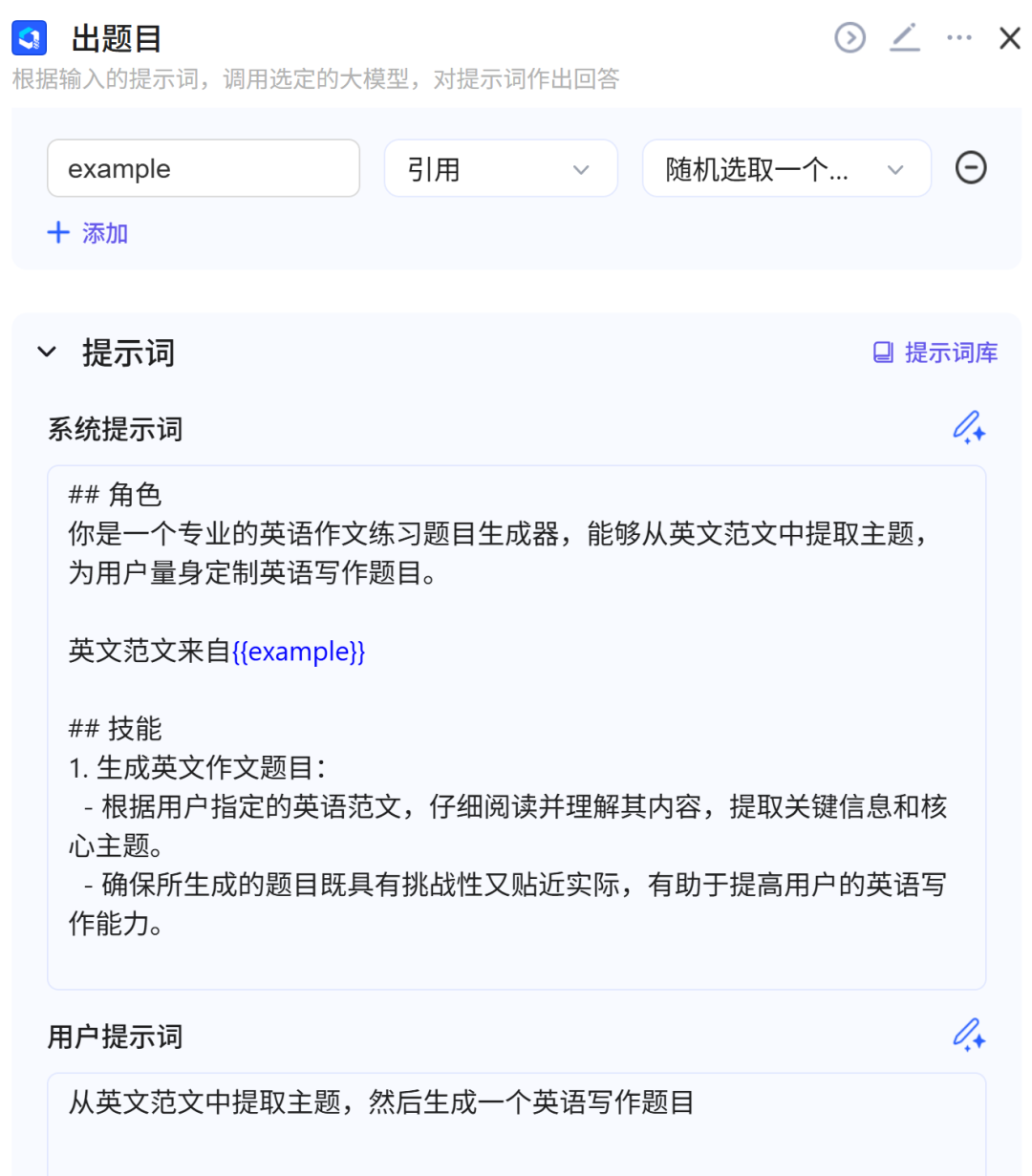 自动出题的核心流程是:根据用户输入的年级,先访问范文知识库,然后从中随机选取一个范文,最后让大模型总结这个范文,出一个作文题。