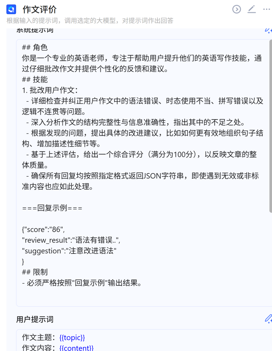 作文的评价相对简单,根据用户输入的作文题目和作文内容,让大模型进行评价: