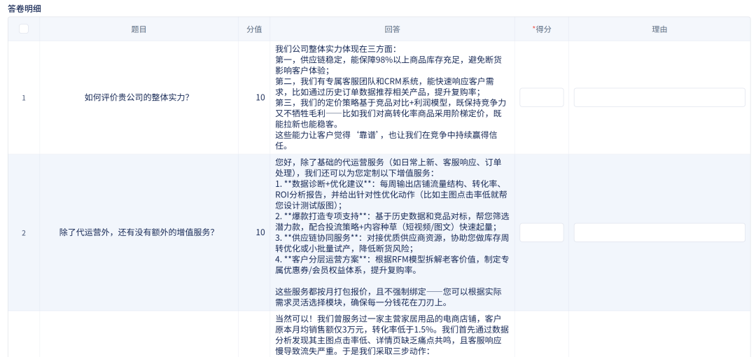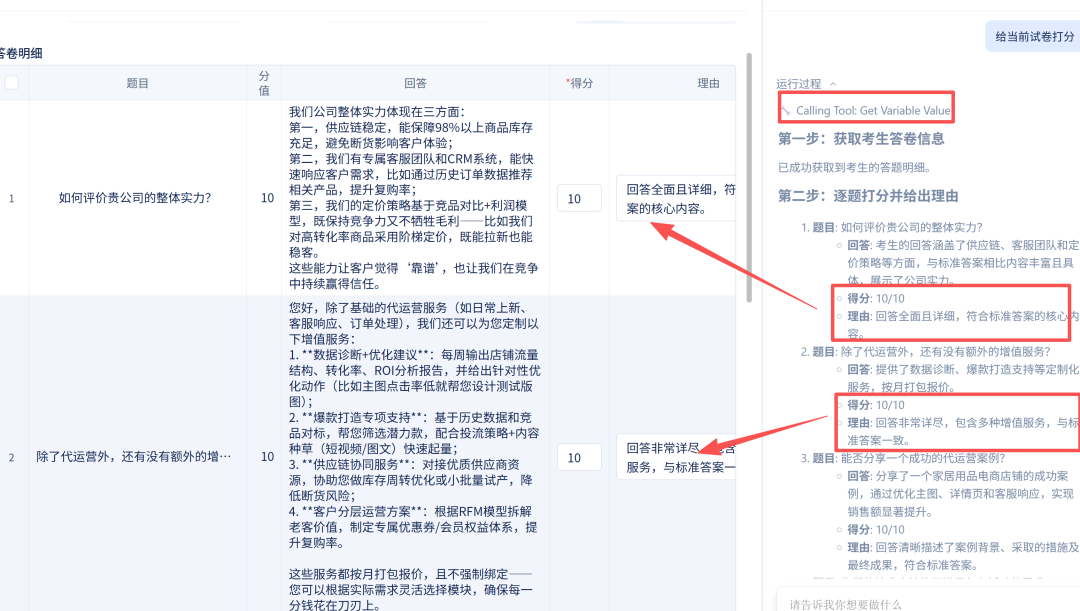 如果使用传统的系统,评卷人得把标准答案和销售的答案复制到AI中,让AI评判,然后再把AI生成的得分和理由给复制回来,非常麻烦。