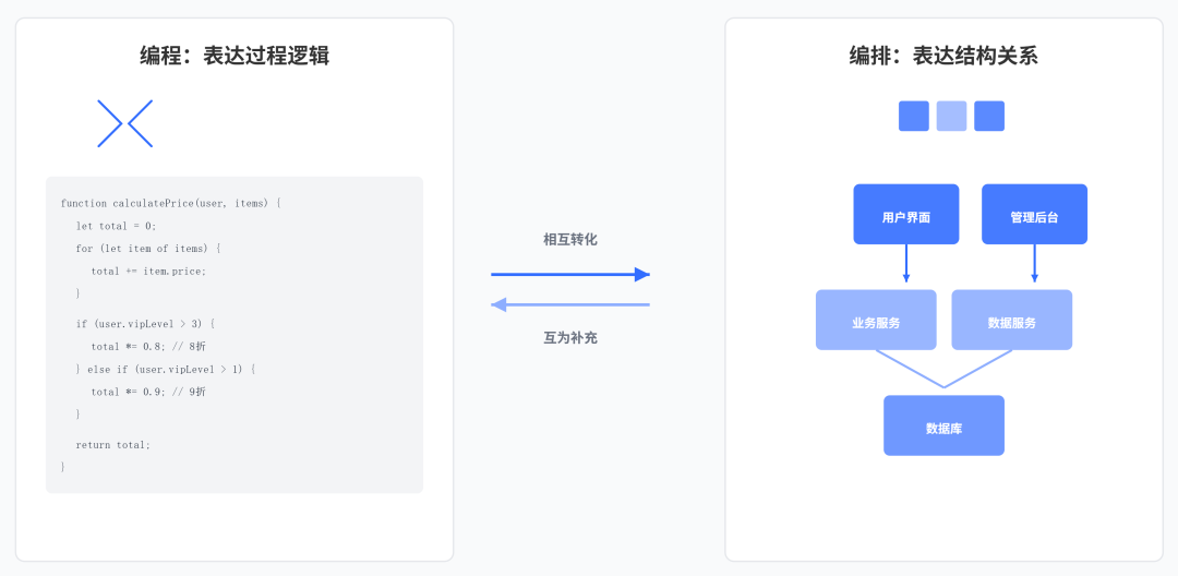 任何IT系统都是由过程和结构共同组成的,编排形成结构,定义系统由哪些模块组成、模块之间如何关联;编程实现过程,描述系统如何运行、业务逻辑如何执行。